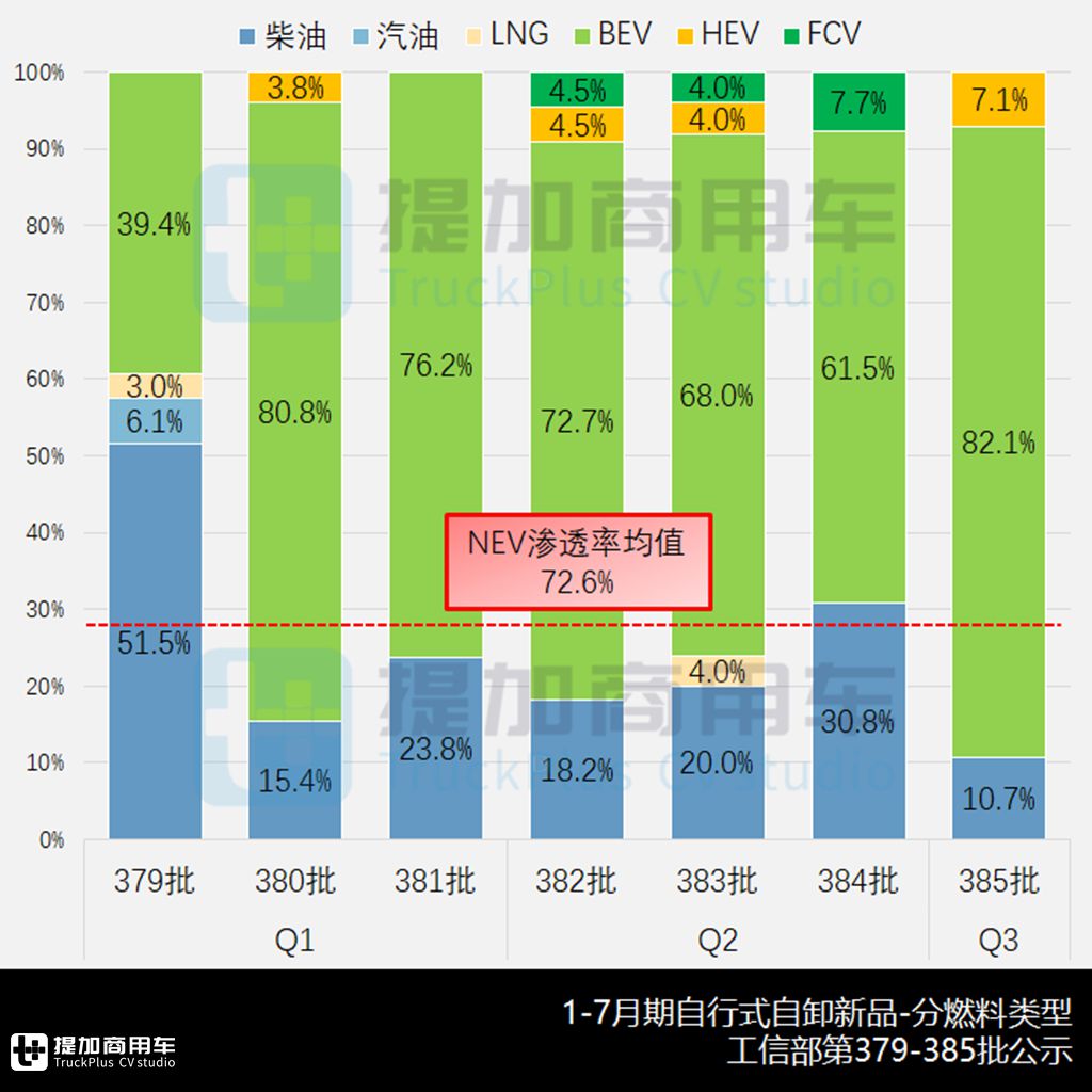 从燃料类型可知,氢能和混动之于自卸类新品尚属电动化的小众派,二者并非每月都有出镜,且单月合计份额也从未超过两位数,故有限的FCV和HEV新品也显得“弥足珍贵”。从可持续发展和多元化角度出发,二者具备极大的增长潜力,对电动商用车更具实际意义,故本文也做单独盘点。