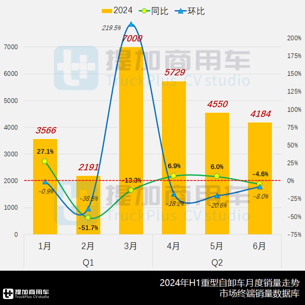 根据市场终端数据,对2024年上半年H1市场走势进行简析,数据对象为N3类/重型自卸车,GVW按14吨以上进行框定,不包括非公路和海外出口部分。