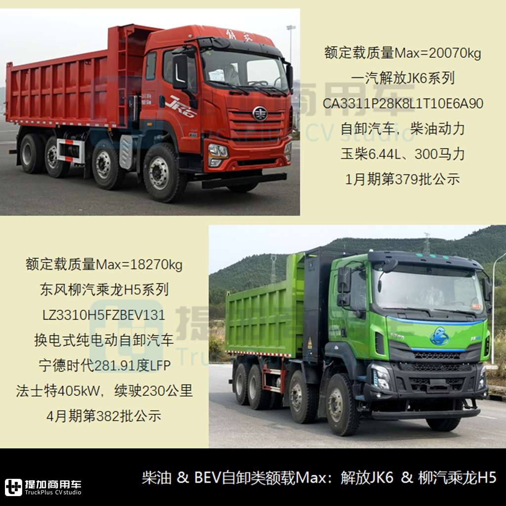 BEV新品额定载质量Max=18270kg,即东风柳汽4月期申报的乘龙H5系列LZ3310H5FZBEV131换电式纯电动自卸汽车和底盘,基础车宽2.5米、准乘2/3人,整备质量12.6/13.8吨,还有18.2/17.07/17吨等三组额定载质量,搭载宁德时代281.91度LFP动力电池、后背式换电方式(cab-back battery swap,已有国标规范命名),法士特405kW电驱系统,续驶230公里。