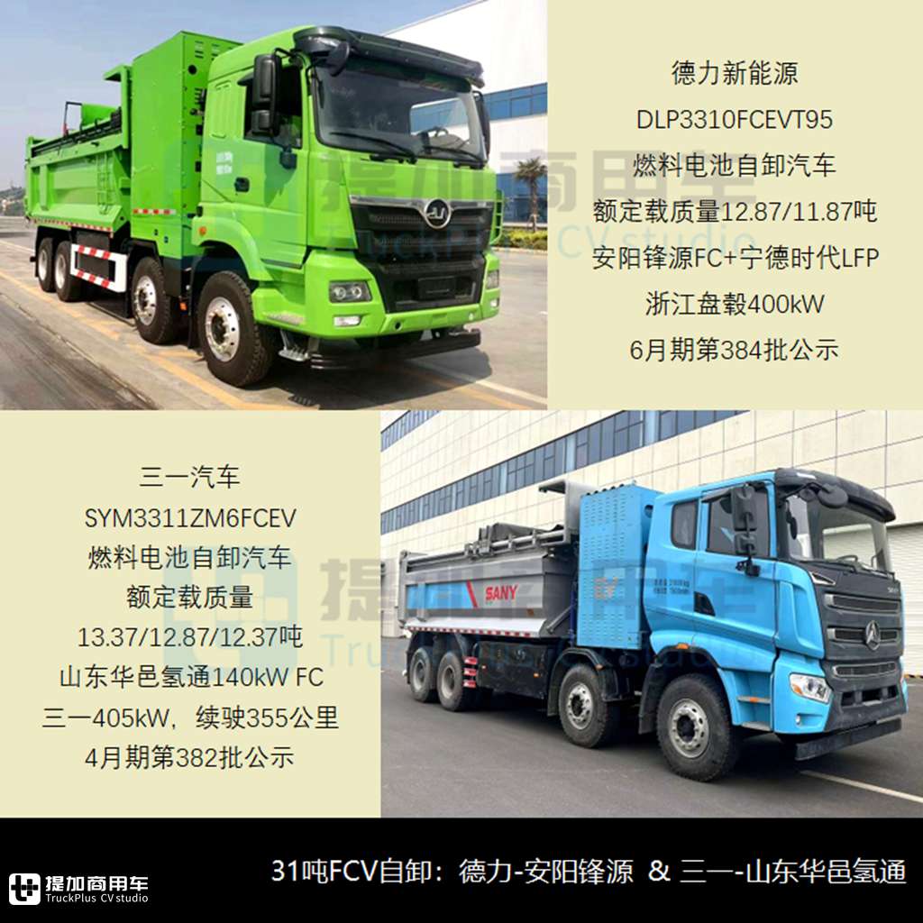 - 河南德力6月期申报了DLP3310FCEVT95燃料电池自卸汽车及底盘,采用三环昊龙同款驾驶室、准乘2人,车长10米、轴距3.6米,货箱长5.6米、额定载质量12.87/11.87吨,搭载安阳锋源燃料电池+宁德时代LFP动力电池,浙江盘毂400kW电驱系统。