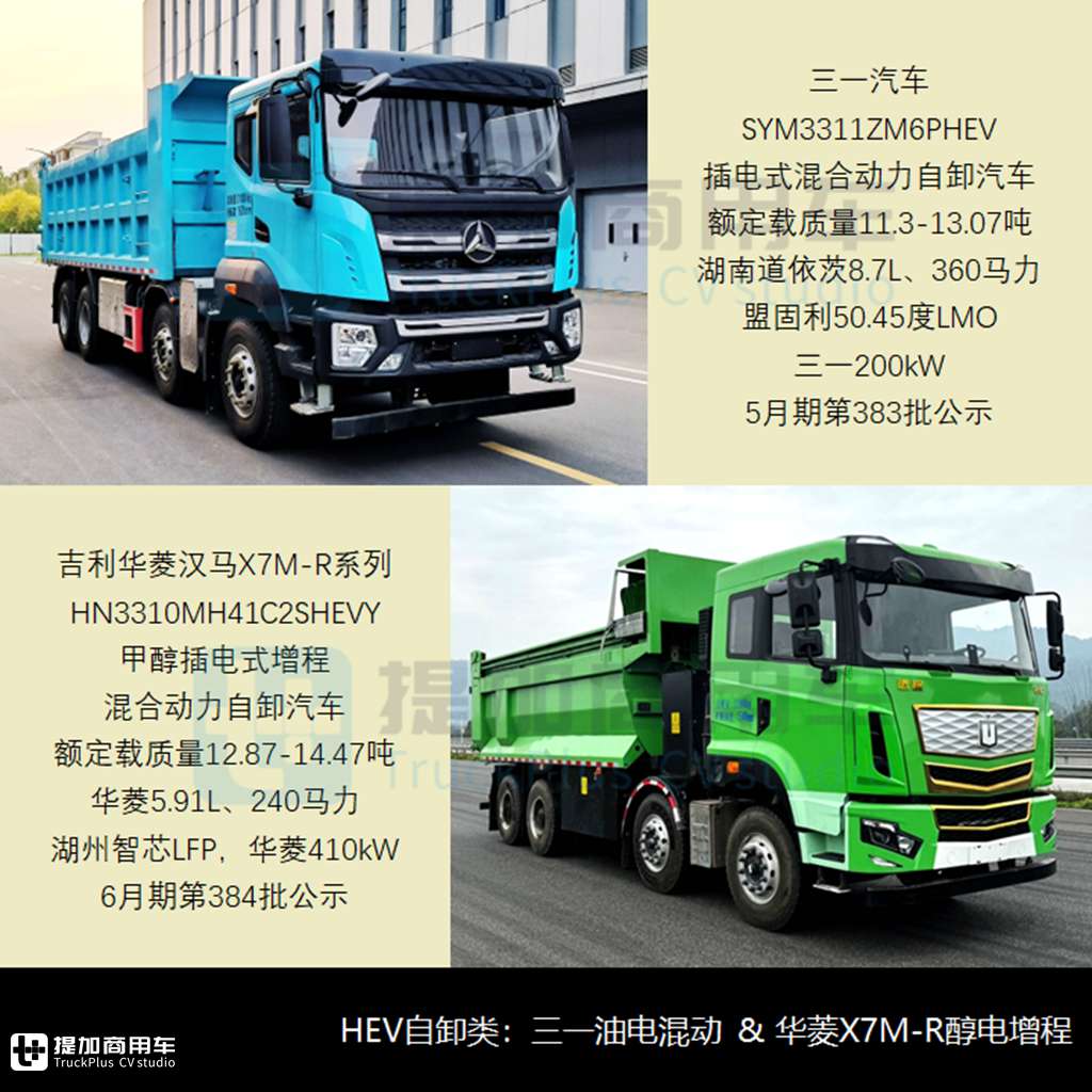 - 吉利华菱6月期申报了HN3310MH41C2SHEVY甲醇插电式增程混合动力自卸汽车,采用4月期申报的HN3310MH41C2SHEVJY底盘车,汉马X7M-R系列驾驶室、准乘2人,货箱长5.6/5.8米、额定载质量12.87/13.77/14.47吨,匹配华菱5.91L、240马力甲醇机,搭载合肥国轩单体、湖州智芯成组LFP动力电池,华菱410kW电驱系统,官网介绍为凯博4档变速箱,醇耗85L/100km。7月期其还申报了HN3310MN44E1SHEVY甲醇插电式增程混合动力自卸汽车及底盘,采用华菱M7系列驾驶室、准乘2人,额定载质量3.87-6.17吨,匹配华菱12.8L、480马力甲醇机,搭载湖州智芯440kW电驱系统、法士特松正4EMT变速箱,醇耗88.5L/100km。由上可知,吉利华菱在醇电增程路线上已做了多种探索,由于市场和客户的多样性,保持多种配置方案并行也是笔者较为推崇的技术路线。