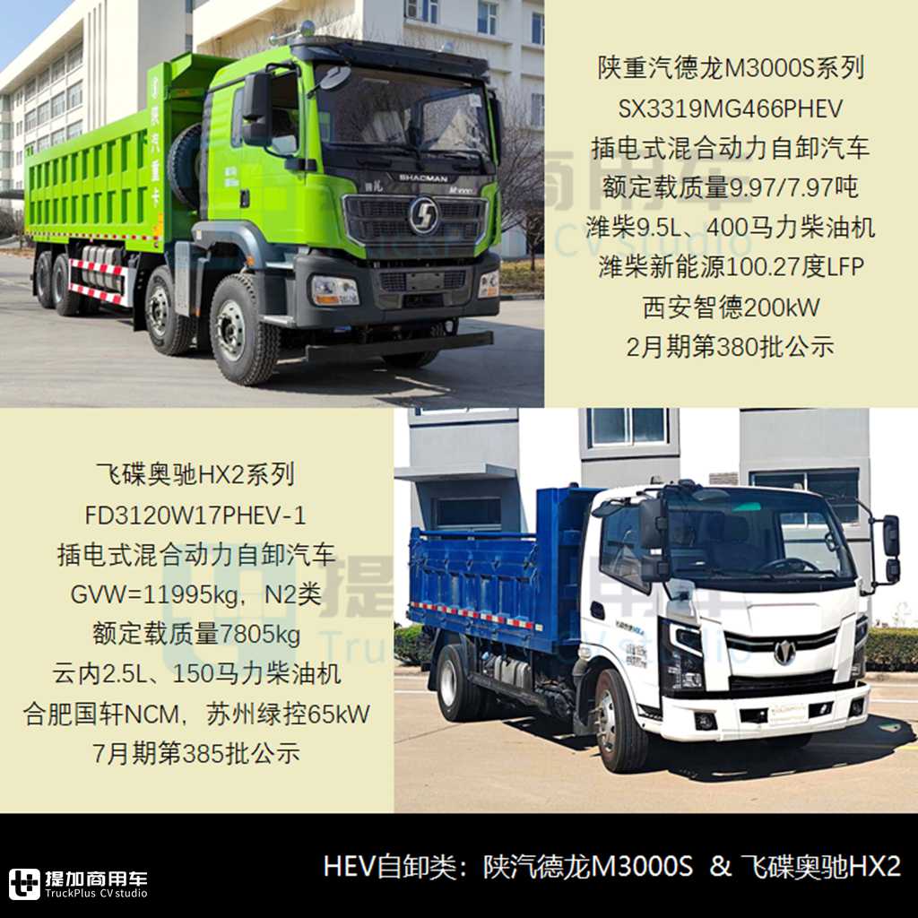 - 陕重汽2月期申报了SX3319MG466PHEV插电式混合动力自卸汽车及底盘,采用德龙M3000S系列驾驶室、准乘2人,轴距4625/4825mm,货箱长7.8/8/8.2米、额定载质量9.97/7.97吨,匹配潍柴9.5L、400马力柴油机,搭载湖北亿纬单体、潍柴新能源成组100.27度LFP动力电池,西安智德200kW电驱系统,油耗36.8L/100km。