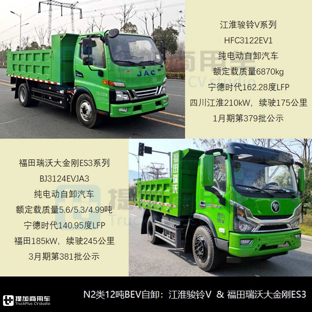 - 江淮1月期申报了HFC3122EV1纯电动自卸汽车及底盘,采用骏铃V系驾驶室、准乘3人,轴距3.3米,货箱长3.5-4.1米、额定载质量6870kg,搭载宁德时代162.28度LFP动力电池,四川江淮210kW电驱系统,续驶175公里。