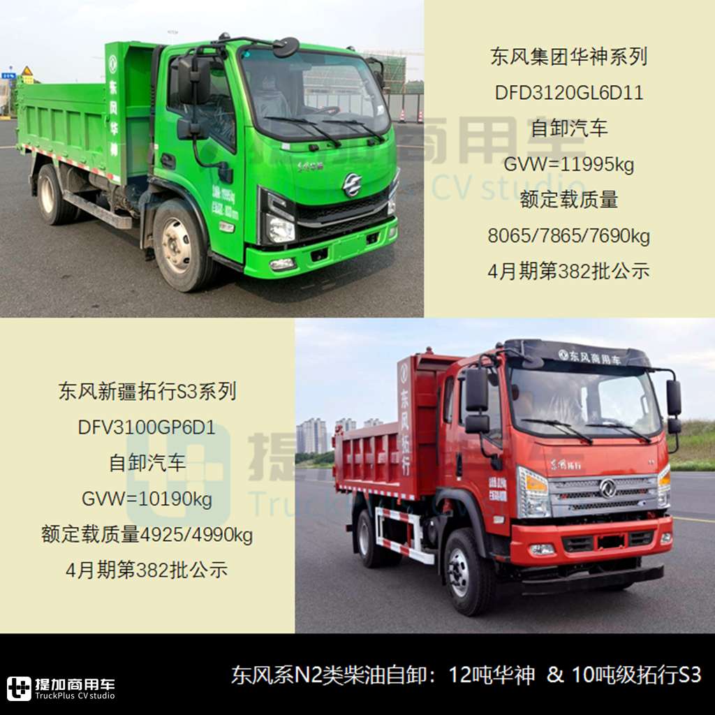 在自卸市场,东风系始终拥有不错表现,在过去一年中名列前茅,可与重汽、陕汽和北汽系等企业相提并论。除了在重型自卸领域有所建树外,N2类中卡自卸也始终是东风系重点布局的方向,本期内有东风华神和东风拓行S系共三款新品,是行业申报数量最多者。具体看: