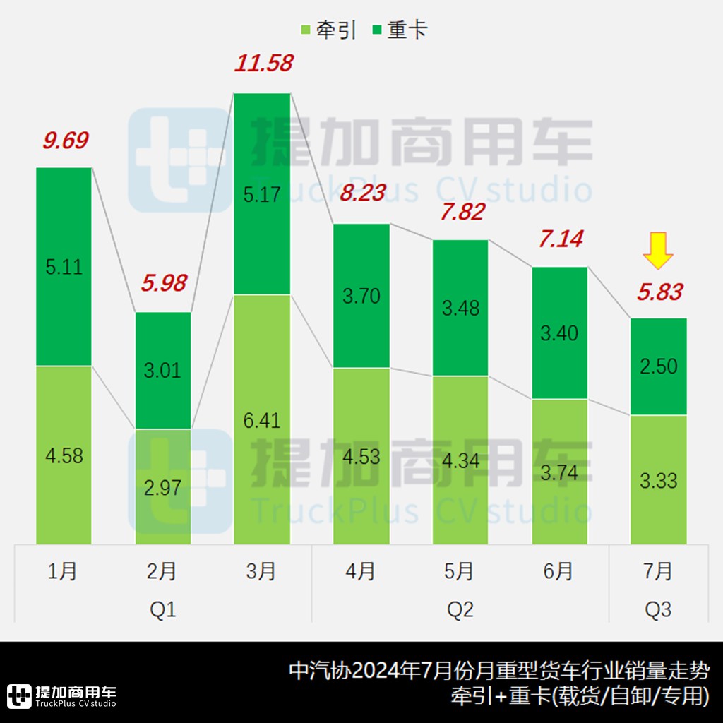 根据中汽协数据统计:今年7月份重型货车市场销售5.83万辆,其中:同、环比分别下降4.9%和18.3%,虽说年中淡季期来临,但“四连降”仍为下半年蒙上些许阴影。具体:半挂牵引类销售2.50万辆、同比微增2.4%,重卡类(载重/自卸/专用类)销售3.40万辆、同比下降13.1%——二者可谓“冰火两重天”。累计来看,今年1-7月份重型货车累销56.28万辆、同比增速2.3%再度收窄,大有全年销量被逆转之势。其中:牵引和重卡分别为29.90万辆和26.36万辆,二者差异再度被拉开。