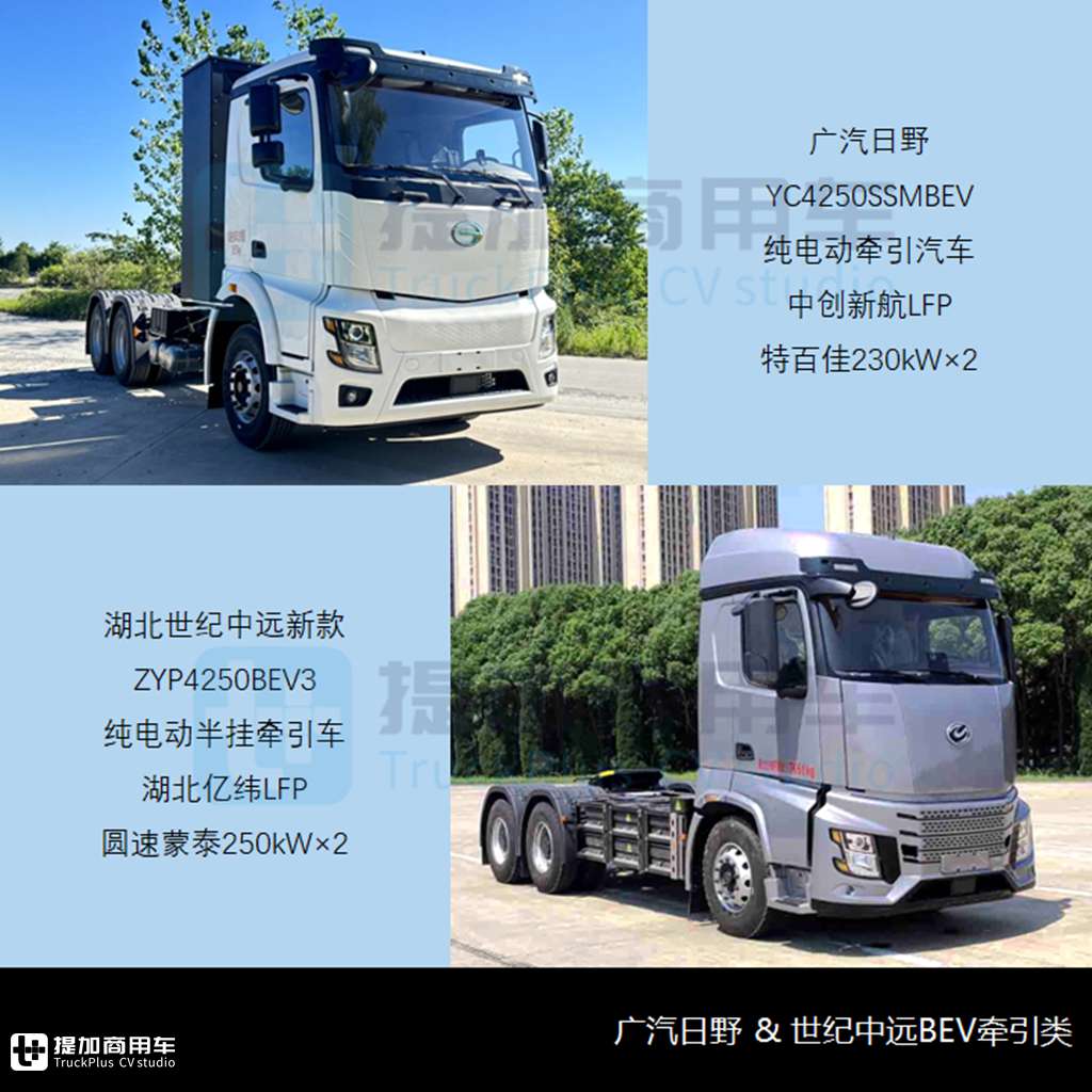 - 广汽日野在上月期推出新能源18吨重卡新品后,继续进行电动化尝试,本月期申报了YC4250SSMBEV纯电动牵引汽车,采用十堰正和TJG230型行业公模驾驶室(东风畅行X7等同款)、准乘2人,轴距3.8米,前/后悬1500/785mm,前3片、后3/4片板簧悬挂,准拖38.57/38.42吨挂车,搭载中创新航LFP动力电池、后背式布置,特百佳230kW×2电驱系统,在规格参数和配套体系相对标准的今天,产品整体中规中矩。