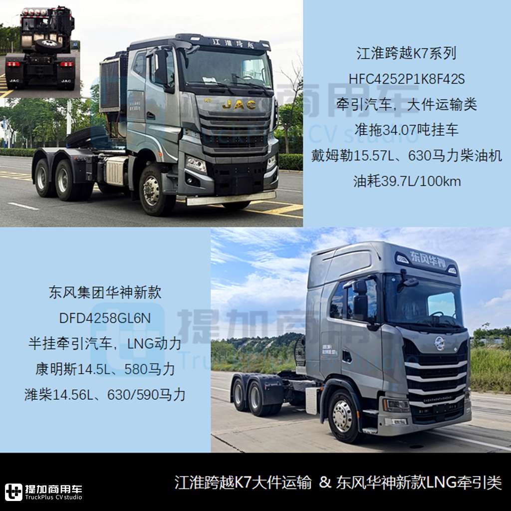 - 江淮申报了跨越K7系列HFC4252P1K8F42S牵引汽车,从结构可知为大件运输类,在驾驶室后有副冷却系统等附件,保留了“前拉后推”的强化结构,准乘2人,轴距4.2米,可选两组板簧悬挂,准拖34.07吨挂车,匹配戴姆勒15.57L、630马力柴油机,油耗39.7L/100km。随着工业、电力、化工等领域对超宽超重且不可拆解的设备需求量增多,大件运输日益兴起,极大促进了我国重大技术装备的发展。此类车辆往往对发动机、传动系统、冷却系统和热管理技术有更高的要求,也是牵引车中不可或缺的重要品类。