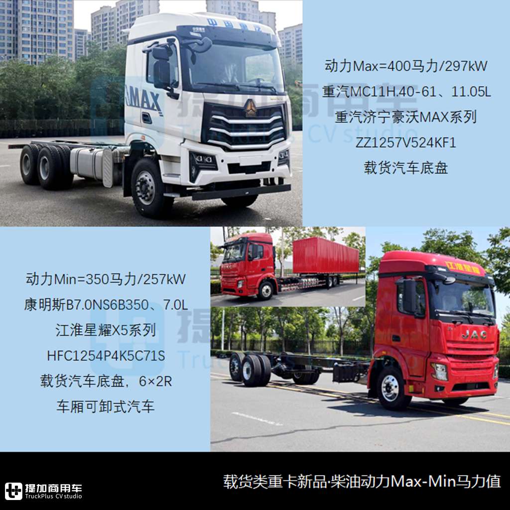 载货类柴油动Max=400马力/297kW,即重汽11.05L的MC11H.40-61柴油机,由重汽济宁ZZ1257V524KF1载货汽车底盘采用,豪沃MAX系列驾驶室、准乘2/3人,可选TS7系列超高顶,驾驶室后方左侧高位进气、右侧高位排气,为特殊工况而设计,可选七组板簧悬挂,6×4形式、后双胎驱动,最高102或限速89km/h。