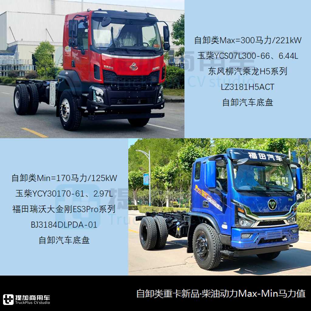 自卸类柴油动力Max=300马力/221kW,即玉柴6.44L的YCS07L300-66柴油机,由东风柳汽LZ3181H5ACT自卸汽车底盘采用,乘龙H5系列系列驾驶室、可选M3造型,基础车宽2.5米、准乘2/3人,可选3.8-4.8米五组轴距、四组板簧悬挂,还可选同系族270马力方案,同期申报有车长7095-7675mm的LZ3181H5AC1和车长7895-8275mm的LZ3181H5AC2两款整车,对应货箱长4.5/4.8/5米和5.3/5.4/5.6米,额定载质量均为8.87/8.8吨、载质量利用系数1.00,油耗27.7L/100km。