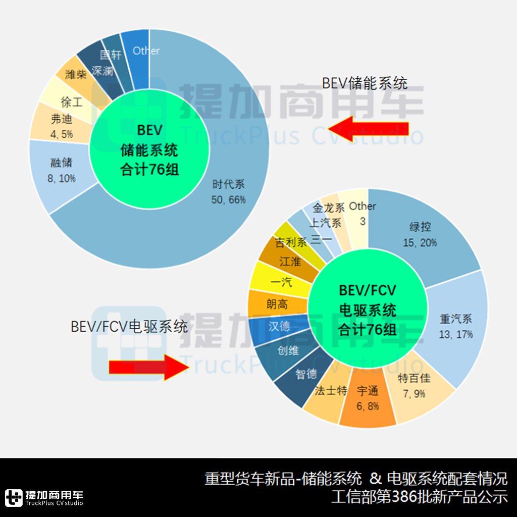 - 本批的BEV+FCV重型货车新品折算后共计76组电驱系统,内/外配套关系接近8:3:绿控15组和特百佳七组已巩固外配前两名位置,法士特和朗高也能博取一席之地,其他身影则大多失踪;内部企业的重汽系13组“家大业大”,宇通、西安智德、南京金龙等13家企业集团都涉足电驱领域,其中不乏传统整车企业向电动转型的新业务。