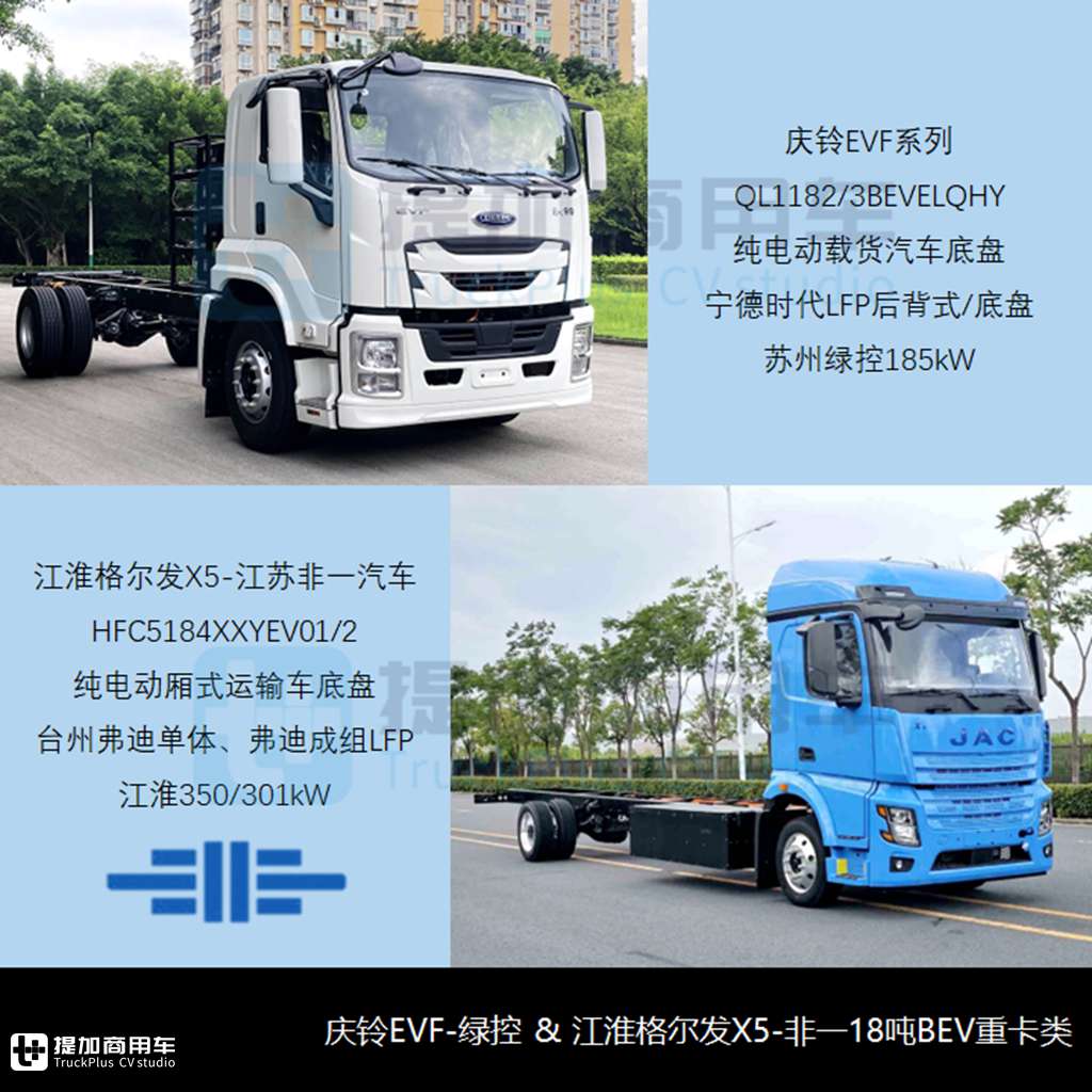 - 庆铃利用五十铃巨咖GIGA产品资源进行“油改电”,申报了两款EVF系列18吨重卡新品,即QL1182/3BEVELQHY纯电动载货汽车底盘,二者均采用前7片、后7+7片板簧悬挂,前者轴距5.35米、后者4.5米,均采用宁德时代LFP动力电池,前者为驾驶室后背式、后者为底盘布置方案,长度也有对应调整。二者均采用苏州绿控GC-TM1300-01电驱系统,额定/峰值功率100/185kW、峰值扭矩1300Nm@3500rpm,2AMT结构。至于该款电驱系统,最早应用于2017年6月第296批的珠海广客GTZ6112BEV1纯电动客车(中兴智能ZTE前身),后也在同属低速工况的18吨环卫车辆上使用,在历经七年后依然能被车企选配,可知电动机相对于内燃机的“保质期”更久。
