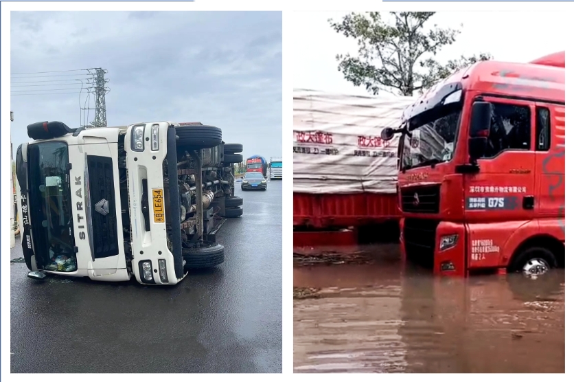 台风“摩羯”过境,沿途的运输车,甚至前来救援的排涝车、物资车都出现了涉水、熄火、侧翻等问题。加之当地电力及通讯系统中断,部分卡友被困且处于失联状态,无法确定具体位置。