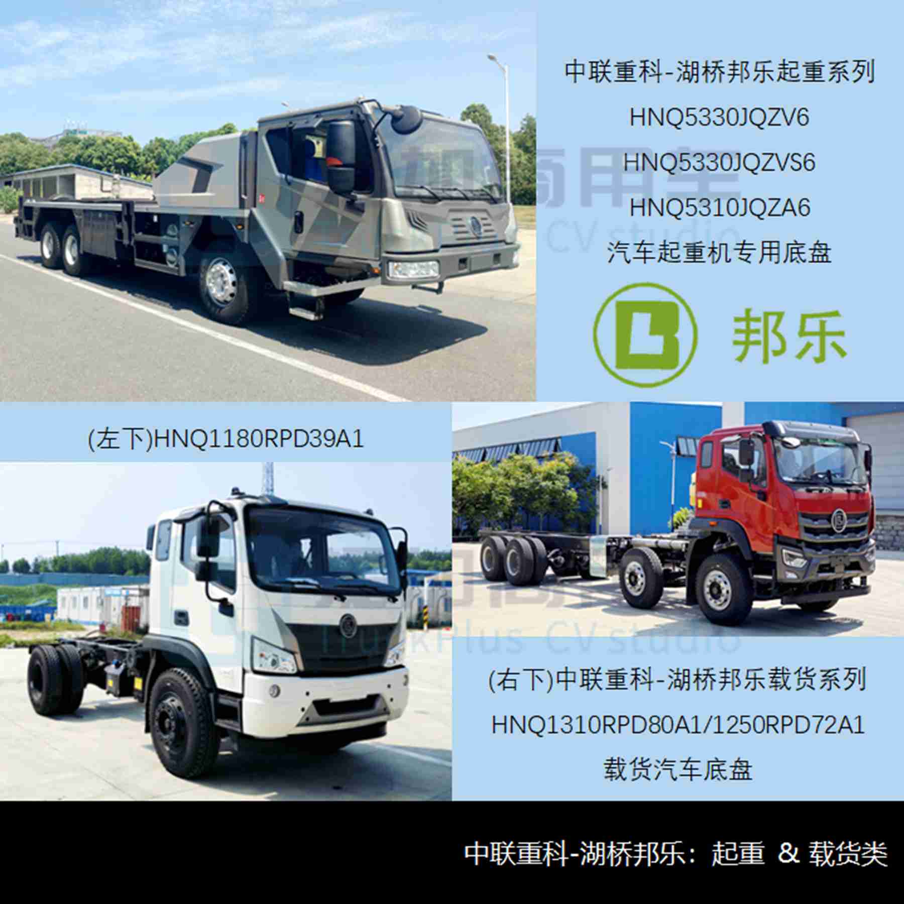 - 首先是著名的起重系列,申报了HNQ5330JQZV6、HNQ5330JQZVS6和HNQ5310JQZA6三款汽车起重机专用底盘及对应整车,均为6×4超限结构,GVW分别为33.1、32.6和31.2吨。三款新品在尺寸设计上略有不同,整车全长13050、12970和12750mm,轴距4725和后两者4700mm,根据轮距可知分属两个不同的底盘平台。以上三款驾驶室均位于前轴中心线以前,以适应起重臂的搭载需要,准乘2人,分别匹配玉柴7.7L、310马力,潍柴6.8L、300马力和玉柴6.23L、270马力柴油机,最高90或85km/h。尽管中联重科可生产自用特种作业车底盘,但相较徐工或三一的操作——即整车类的主体企业生产底盘,专业分工的改装企业生产上装——仍有明显不同。好在中联系也同时拥有整车目录牌照,此时盘活空闲资产也是可行之策。对于广大熟悉中联“Z字标”的客户,未来可能还要更多接触邦乐牌的“B字标”。