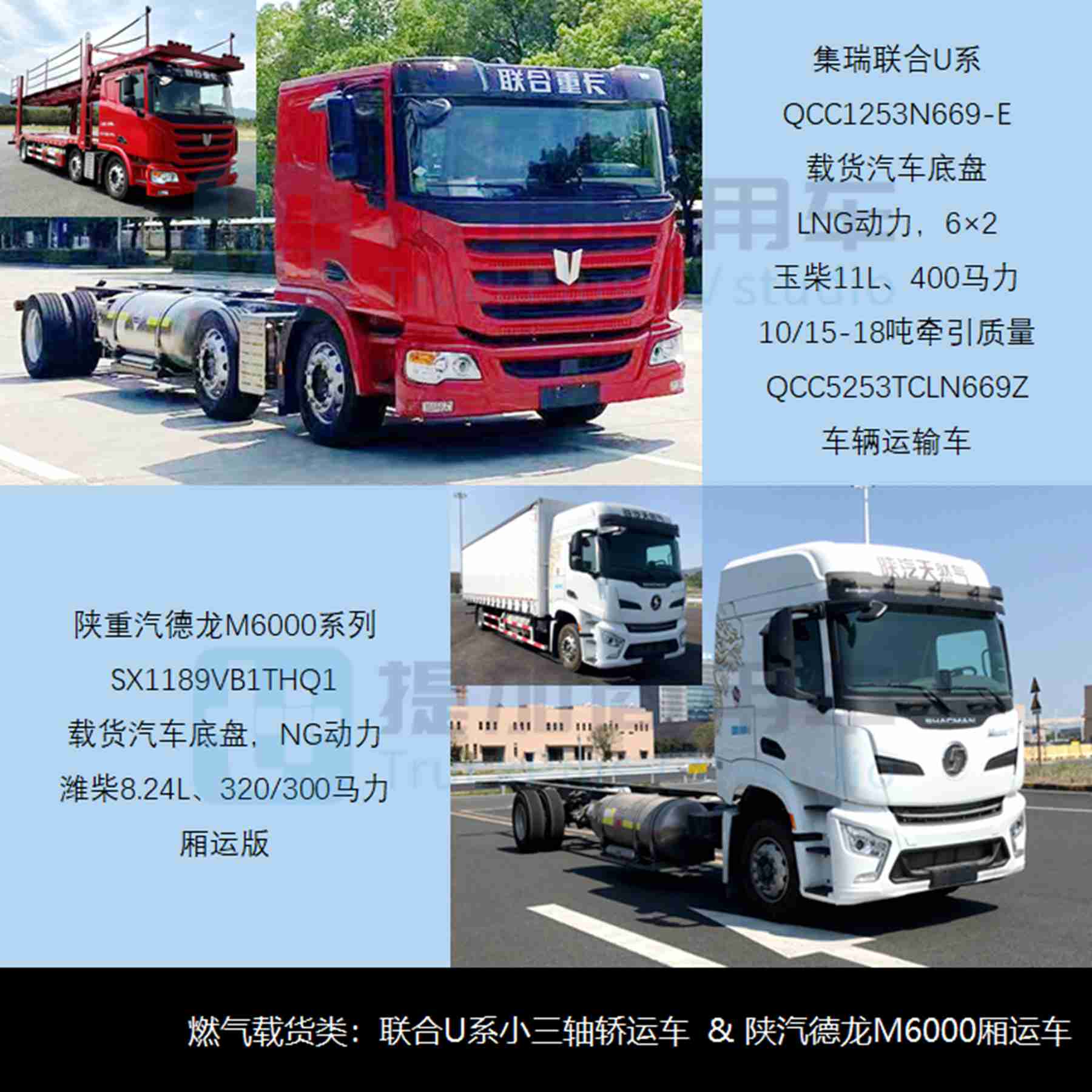 - 集瑞联合申报了QCC1253N669-E载货汽车底盘以及QCC5253TCLN669Z车辆运输车,采用LNG动力、气瓶轴间两侧底置,联合U系驾驶室、准乘2人,6×2小三轴结构,双前2/3片板簧、后复合悬挂,匹配玉柴10.98L、400马力气体机,形成整车后额定载质量12.1吨,同时可牵引10/15-18吨五组中置轴挂车,最高110km/h。在长途运输燃气热的背景下,业内陆续出现一些LNG轿运车,主要以东北车企的解放悍V系列25吨小三轴为主、合计七款,而集瑞联合本次新品也提供了另一种解决方案。