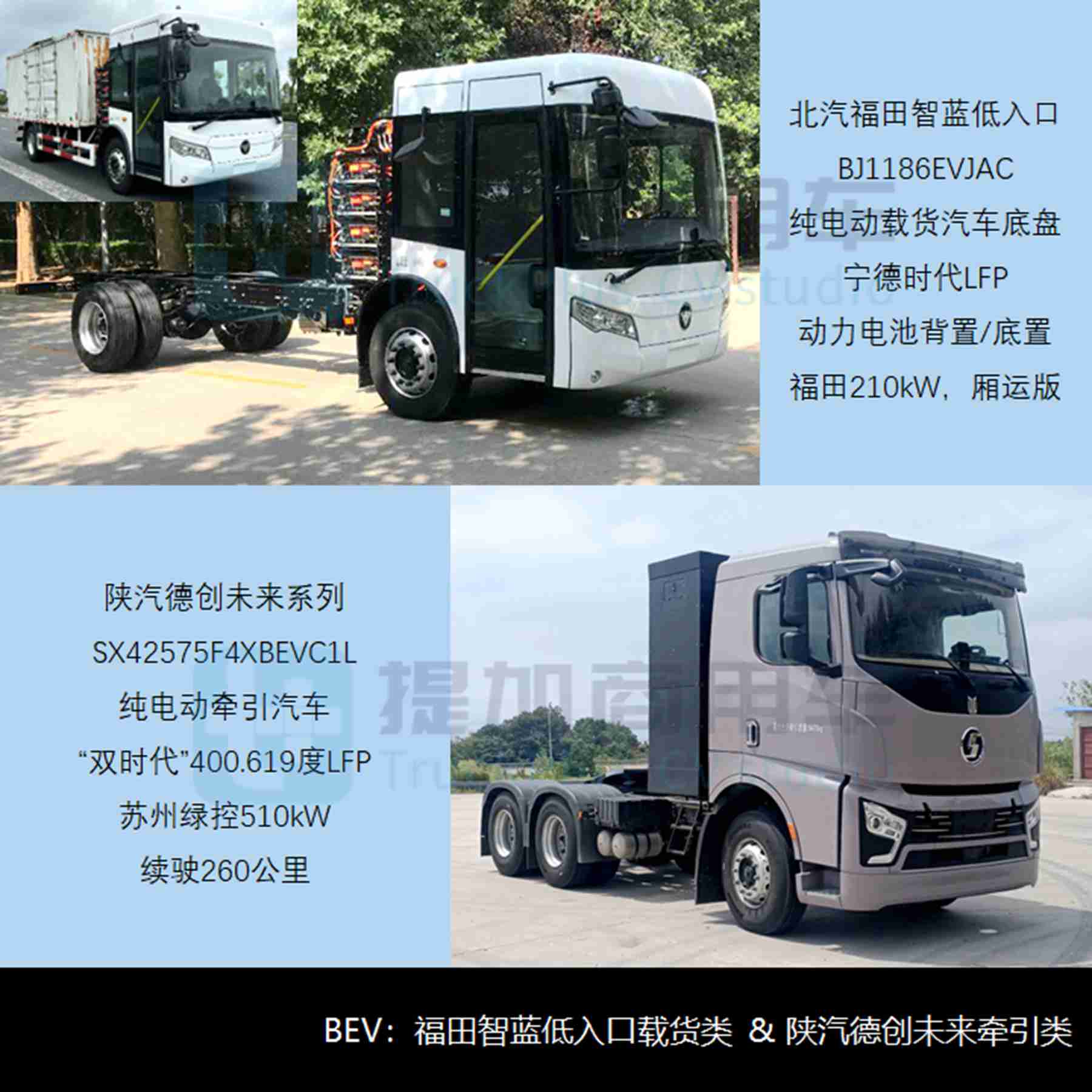 福田智蓝低入口BEV厢运,一汽-华丰-广州巨湾、东风集团自用FCV牵引