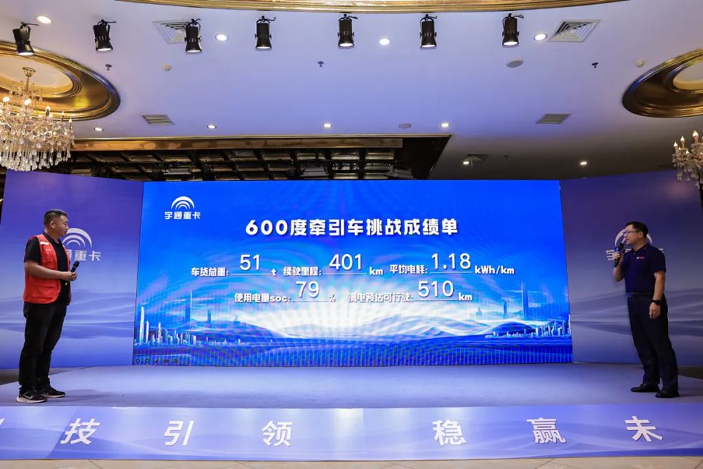 在发布会之前,宇通重卡600度牵引车进行了一次信心十足的实况续航挑战。车辆在实况运输场景下满载51吨全程历时10小时往返广西贺州、梧州两地,凭借一次充电轻松长续航的实力,最终以1.18度/公里的电耗表现完成401公里长续航挑战,车辆使用SOC值为79%,满电预估可行驶最长里程为510公里。真实场景、真测挑战、现场公布成绩,不仅展现出宇通600度牵引车的硬核实力,更展现出宇通重卡说到做到的价值承诺。