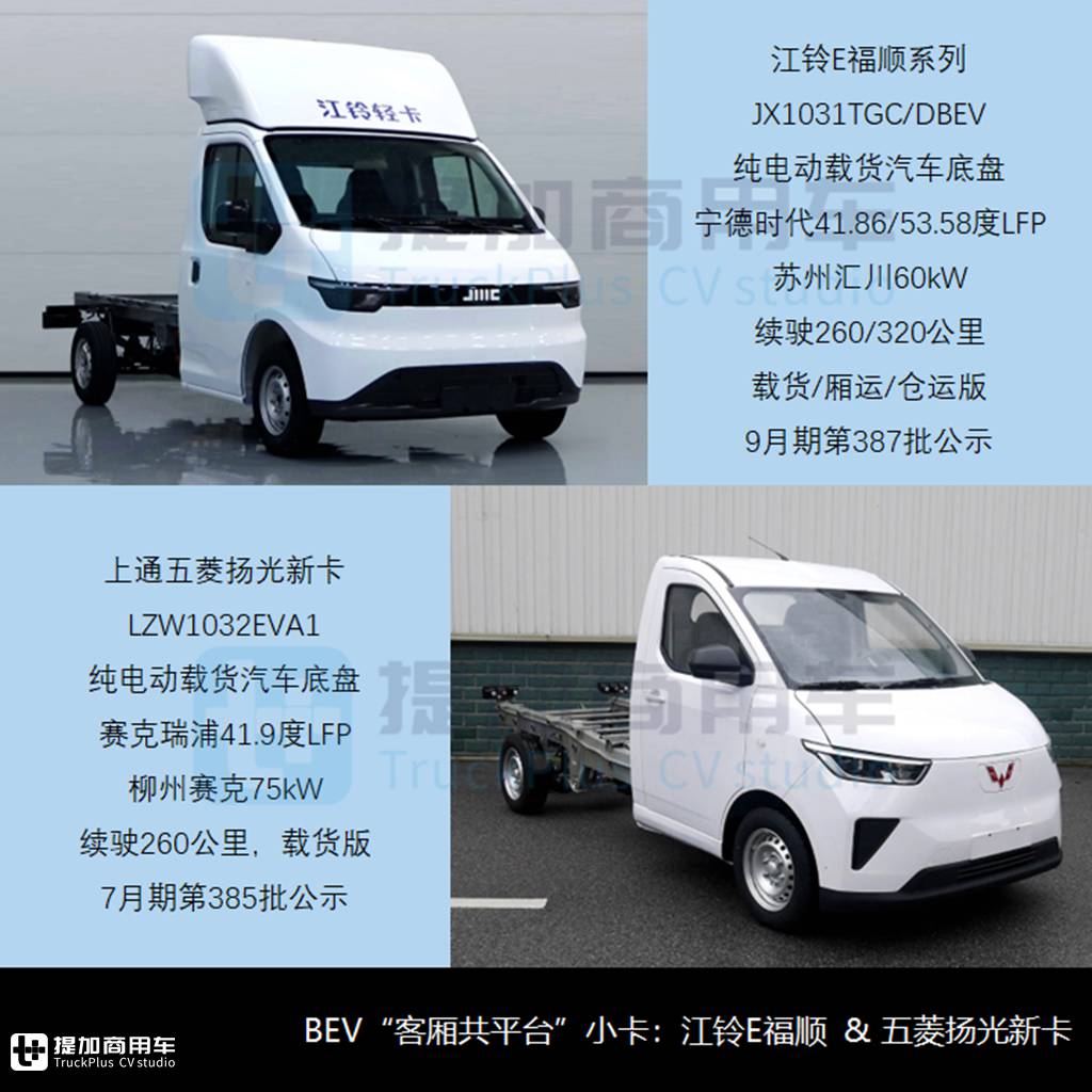 - 江铃近来开始在3吨级LCV发力,推出了E福顺系列全新平台及两种基本型,此前笔者已在9月期客车篇中介绍BEV客厢版,同月期还申报有共平台的JX1031TGC/DBEV两款纯电动载货汽车底盘以及载货/厢运/仓运版整车。以上两款新品均采用3360mm长轴规格,1890mm车宽以及1634mm前/后轮距与主平台一致,单排驾驶室准乘2/3人(此处3人已进入“宽体”范畴),前悬710mm,GVW=3200kg,后单胎驱动、可选185/195号两种轮胎,车架为变截面纵梁+Ω横梁结构,搭载宁德时代41.86度和53.58度LFP动力电池,苏州汇川60kW电驱系统。以载货版为例,形成整车后全长5465mm、栏板长3.2米,额定载质量1365-1455或1300-1390kg,续驶260或320公里,最高90km/h。从该平台的构建方式可知,车企在产品开发时可以利用共平台思路做到资源最大化,实现“一次开发覆盖多款车型”的目的,在2-3吨级这一客货车型汇聚点上(甚至是商乘)可有更多的作为。
