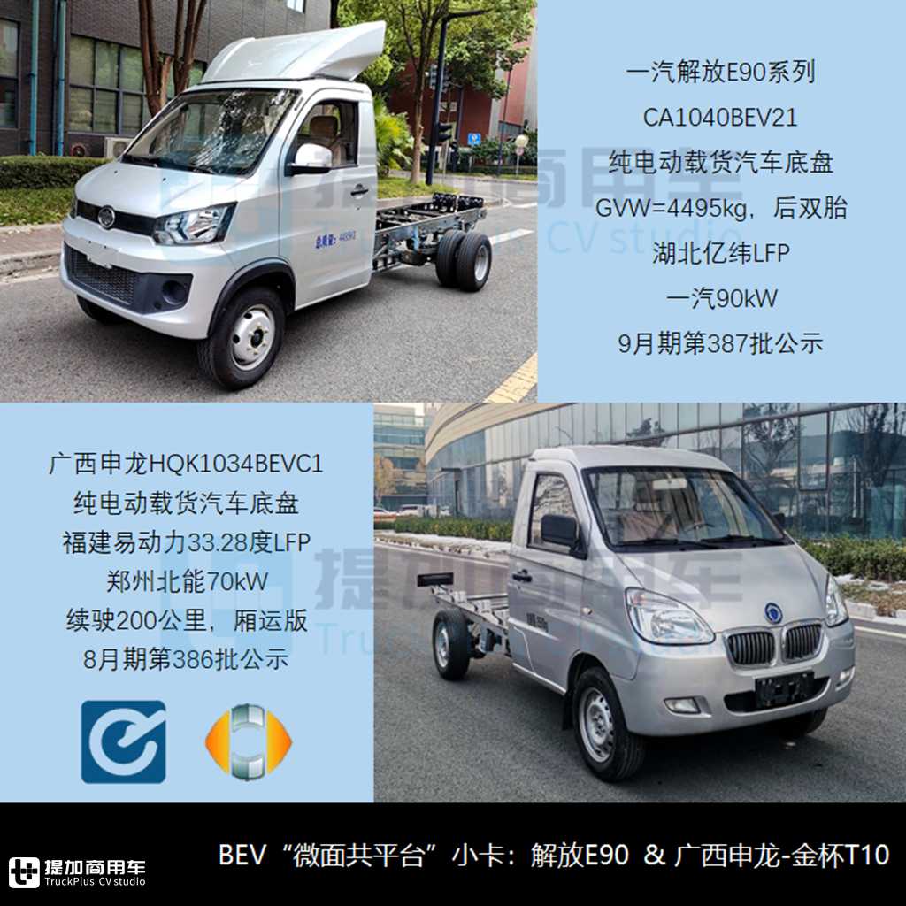 - 一汽9月期申报了解放E90系列CA1040BEV21纯电动载货汽车底盘,GVW=4495kg达到蓝牌轻卡上限,但仍沿用微卡加强架构,可看出与解放微面V80/微卡T80的共平台属性。该底盘采用后双胎驱动、185号轮胎,具备加强重载能力,全长5075mm、轴距3300mm,基础车宽1.8米、准乘2人,选装导流罩、具备普货运输特征,前6片、后7+4片板簧悬挂,搭载湖北亿纬LFP动力电池,一汽自用90kW电驱系统,最高90km/h。
