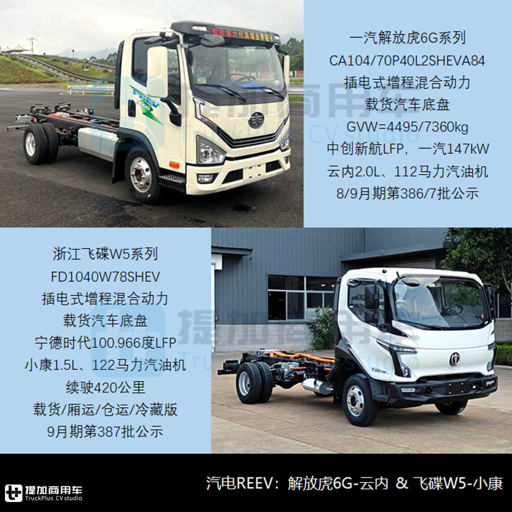 - 8-9月期,一汽携手云内动力,申报了解放虎6G系列CA104/70P40L2SHEVA84两款插电式增程混合动力载货汽车底盘,匹配云内G20MPID1型2.0L、112马力汽油机,首度切入商用车的汽电增程领域。该系列新品可视为“同一平台、两种规格”,GVW=4495/7360kg也是轻卡/大轻卡的常见设置,驾驶室宽2060mm、准乘3/2人,7吨级新品可选后围贯通口、显见是为旅居车预备。该系列轴距3.4米,可选18组板簧悬挂,搭载中创新航LFP动力电池,一汽自用147kW电驱系统,4吨级与厢运版同期申报公告,形成整车后货箱长4.16米、额定载质量850kg,油耗13.7L/100km,最高95km/h。