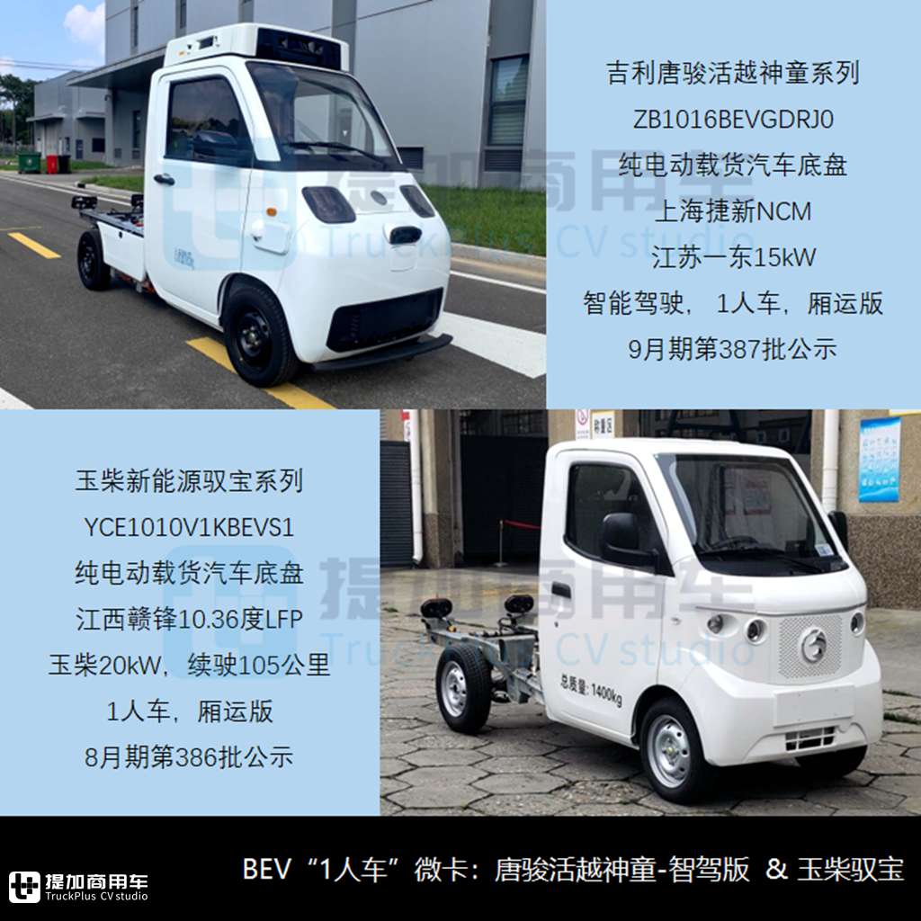 - 吉利唐骏9月期申报了活越神童系列的两款新品,包括ZB1022BEVGDRJ0和ZB1016BEVGDRJ0纯电动载货汽车底盘,以及厢运版整车。前者GVW=1950kg,搭载合肥国轩15.97度LFP动力电池,江苏一东航空27kW电驱系统,额定载质量1095/1080kg,续驶150公里,最高71km/h。后者GVW=1065kg,搭载宁德时代单体、上海捷新成组NCM动力电池,一东15kW电驱系统,额定载质量205kg。该车虽然装载质量有限,但搭载了智能驾驶系统,全车多处配备摄像头和雷达探头,包括驾驶室顶部、风挡前方、翼子板和货箱侧后方以及驾驶室后顶部,同时货箱右侧有触摸屏可提供电子取件码,方便快递货物的提取。目前国内多个城市已批量应用无人驾驶物流车(移动机械),为城市物流的末端配送提供了一条新的路径,此前一些M类客车的智能小巴进行了类似的长度缩短和客货舱改制,本次吉利将其扩展至N类货车领域也是对“1人车”资源的有效发掘。