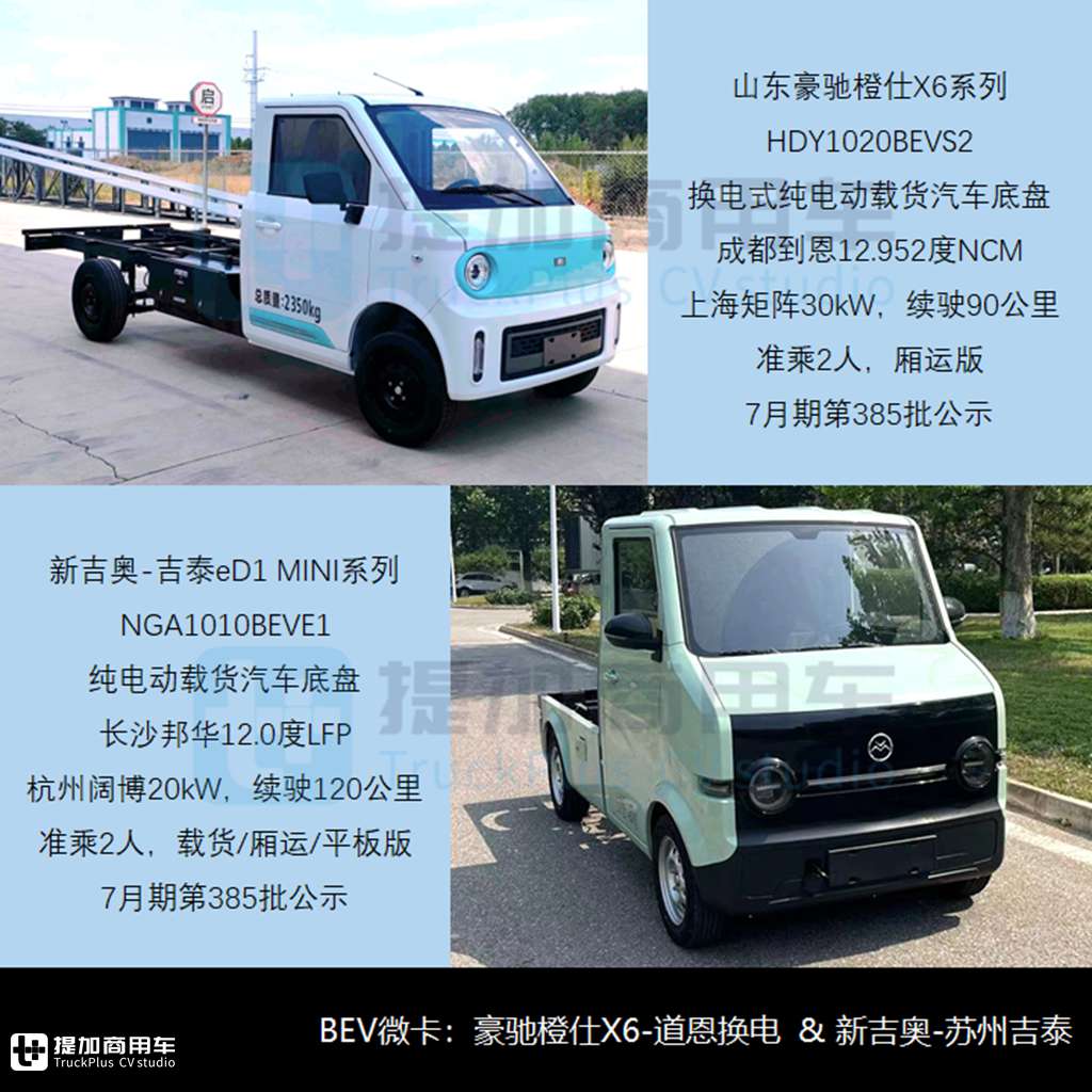 - 山东豪驰7月期携手成都到恩,申报了HDY1020BEVS2换电式纯电动载货汽车底盘以及厢运版整车,采用橙仕X6系列驾驶室,基础车宽1555/1495mm、准乘1/2人,GVW=2350kg,轴距3150mm,前独立、后6片板簧悬挂,搭载赣州孚能单体、成都到恩成组的12.952度NCM动力电池,轴间底置换电式方案,上海矩阵30kW电驱系统。该底盘与厢运版整车同期申报公告,形成整车后全长4960mm,货箱容积5.7-8.1立方米,额定载质量940-1035kg,续驶90公里。对于1-2吨级的BEV微卡车型,采用换电式方案的产品并不算多,主要由吉利远程活跃神童在推动。而成都到恩去年8月期已与贵州万仁合作,申报有换电式WR1025EV和厢式车,定名为“到恩EV06”,可知这也是力主发展换电式城配物流微卡的一股力量。