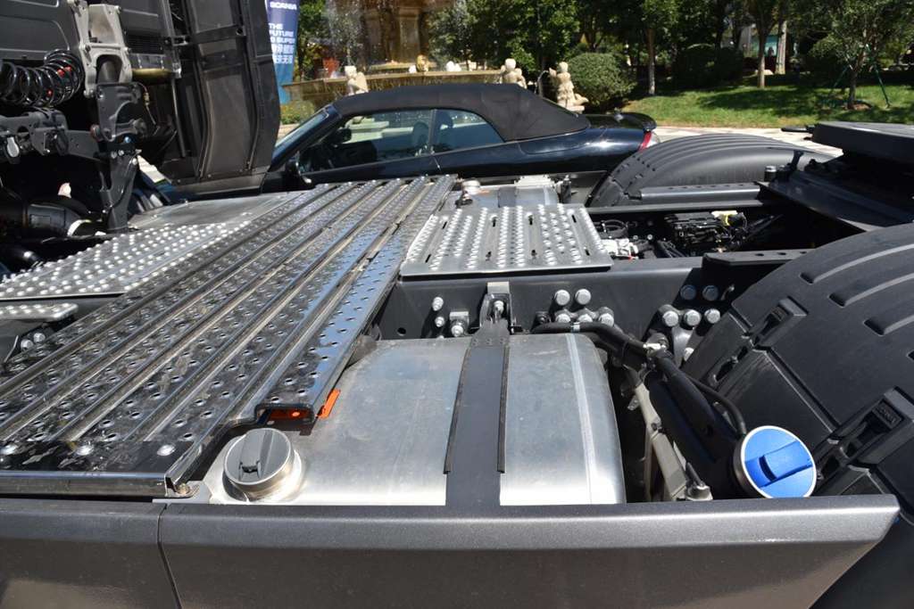 左侧440L主油箱加上右侧525L副油箱,并且在主油箱的侧面安装有创新型的燃油优化装置(FOU)。该装置可以使主油箱的燃油利用率提高至 97%,副油箱的燃油利用率提高至 93%,能够最大限度的降低油耗,减少长途运输过程中加注燃油的次数,提升运行效率。