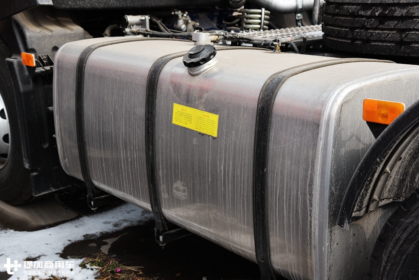 油箱为铝合金材质,只在车身左侧安装单个油箱,容量600L。而车身左侧则集成了排气系统、蓄电池、铝合金储气筒以及尿素系统,排列紧凑,布局合理。