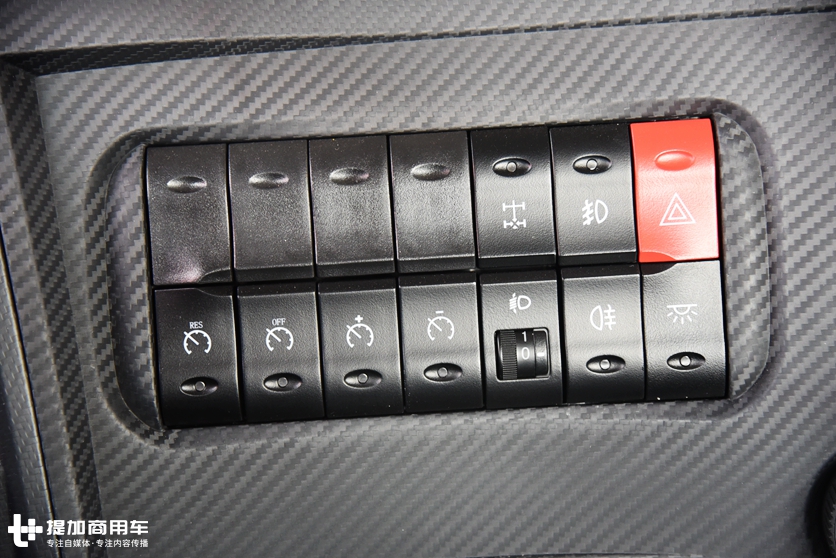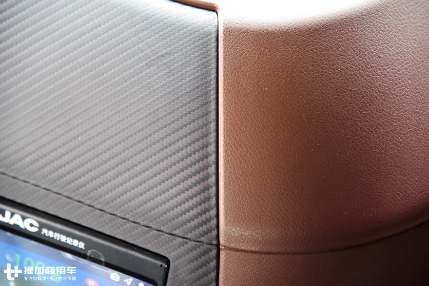 不仅如此,工作区部分区域还采用了时髦的仿碳纤维复合材料,在光线照射下,光泽纹理很是好看,为驾驶室营造出一种高级感来。
