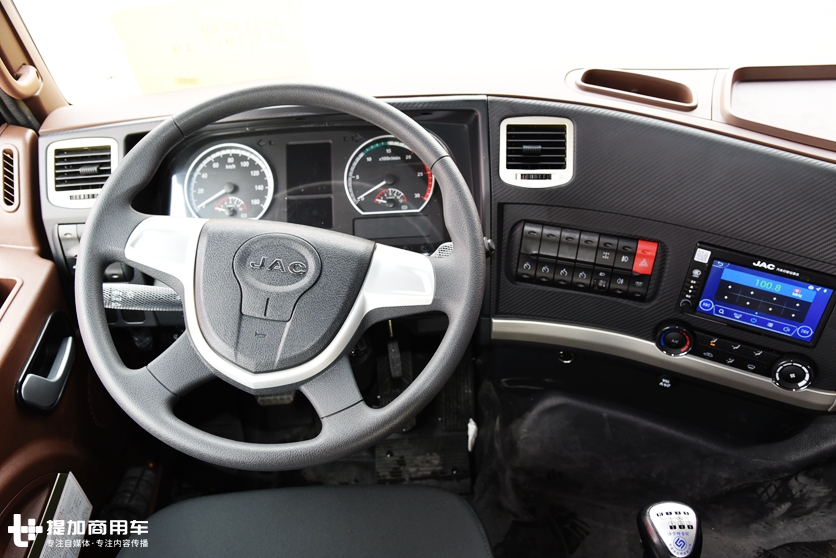 方向盘标准四副,不带多功能按键,但被销售告知多功能方向盘为可选配置。另外,方向盘造型与江淮轻卡的方向盘类似甚至是一样,看上去与整车所带给我们的重卡形象不符。那么关于这个方向盘,也是全车为数不多的不足之处中的一个,并不能让人满意。