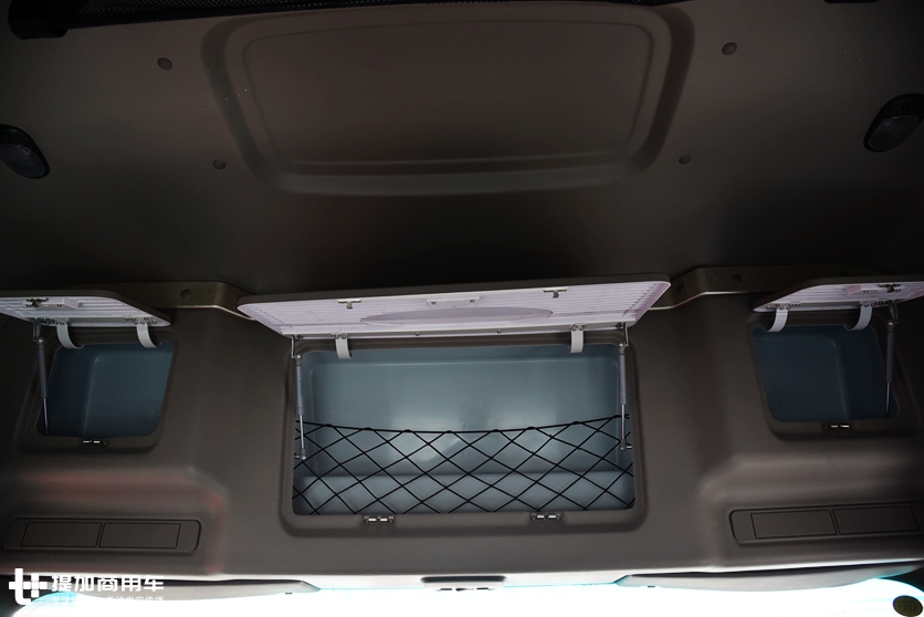 驾驶室顶部储物空间并不是很丰富,三个储物柜容积较小,虽然中间的储物柜稍大一点,但三个储物柜都有一个共同的缺陷,那就是空间纵深不足,导致储物空间有限。