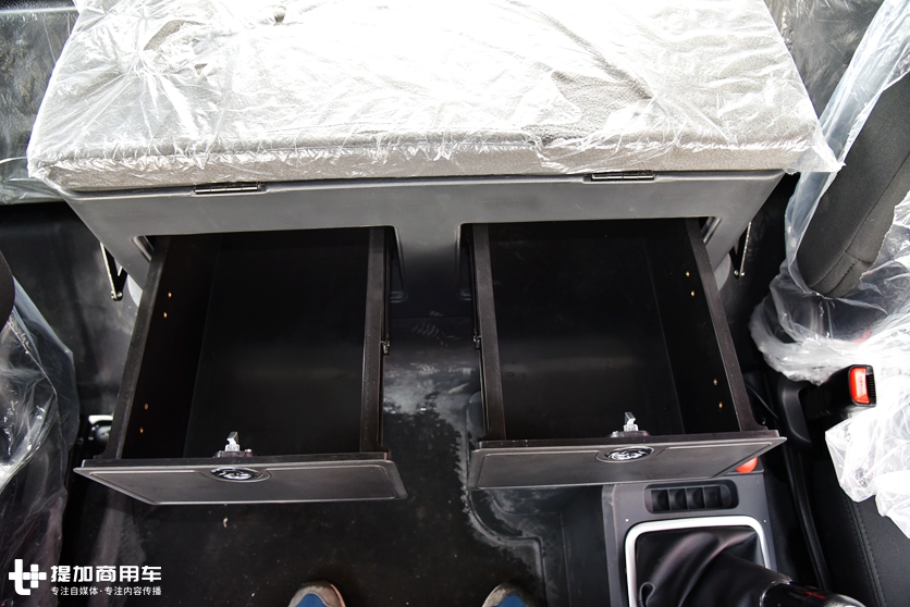 值得一提的是,K5在卧铺利用率上可以说是出类拔萃了,卧铺底部都是储物空间,掀开垫子,有三个容积很大的箱子,唯一不足就是拿放物品不是很方便。另外,卧铺前端还有两个小抽屉,可以放一些零碎物件。