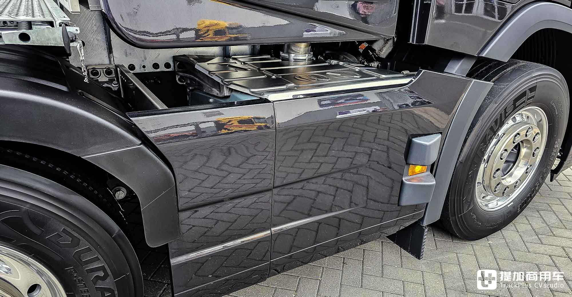 镀铬挡板将刹车储气筒等附件隐藏于其中,并且集成后向射灯及倒车摄像头,易用性更强