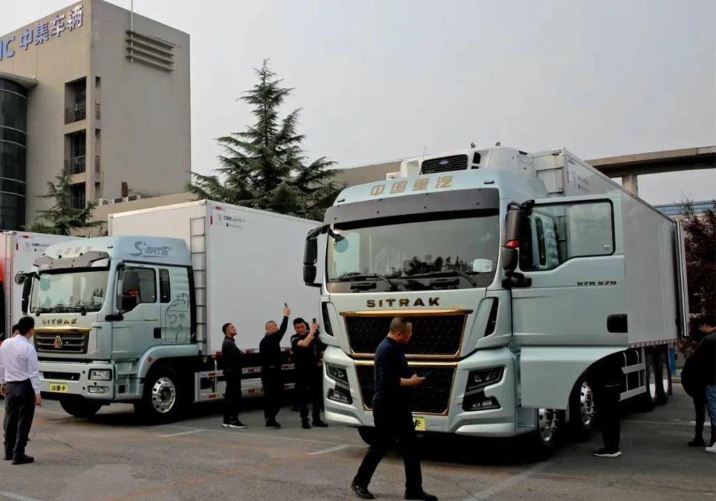活动现场,一辆辆汕德卡冷藏车整齐亮相。它们搭载着来自山东中集的冷藏货厢,高端大气的外观吸引了参会人员的目光,他们纷纷驻足围观。