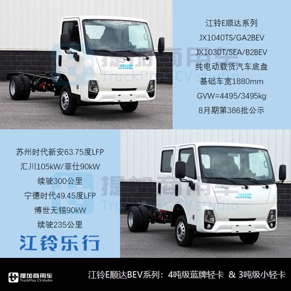 江铃汽车三季度强化3-4吨级轻卡业务的能力建设,申报了全新的“E福顺”和“E顺达”两大产品平台,启用了知名品牌IP,且各有千秋:前者是“BEV客厢+尖头小卡”模式,强调“客货同型”的共平台方式,上篇已做介绍;后者则是“4吨蓝牌轻卡+3吨小轻卡”的产品线构建方式,重点强调N类LCV的产品组合。以下对江铃8月期申报的“E顺达”系列做单独介绍: