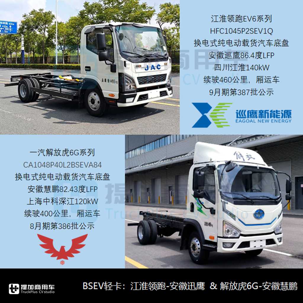 - 江淮9月期携手安徽巡鹰,申报了领跑EV6系列HFC1045P2SEV1Q换电式纯电动载货汽车底盘以及厢运版整车,准乘3人,轴距3365mm,可选两组板簧悬挂,搭载合肥国轩单体、安徽巡鹰成组86.4度LFP动力电池,底置换电方案,四川江淮140kW电驱系统,形成整车后箱长4120/4150mm、额定载质量895kg,续驶460公里。安徽巡鹰新能源集团有限公司成立于2011年3月,位于合肥新站高新区,2019年与安徽国投、国轩高科战略合作,目前与重汽成都王牌、湖北三环都有4.5吨BSEV轻卡合作。