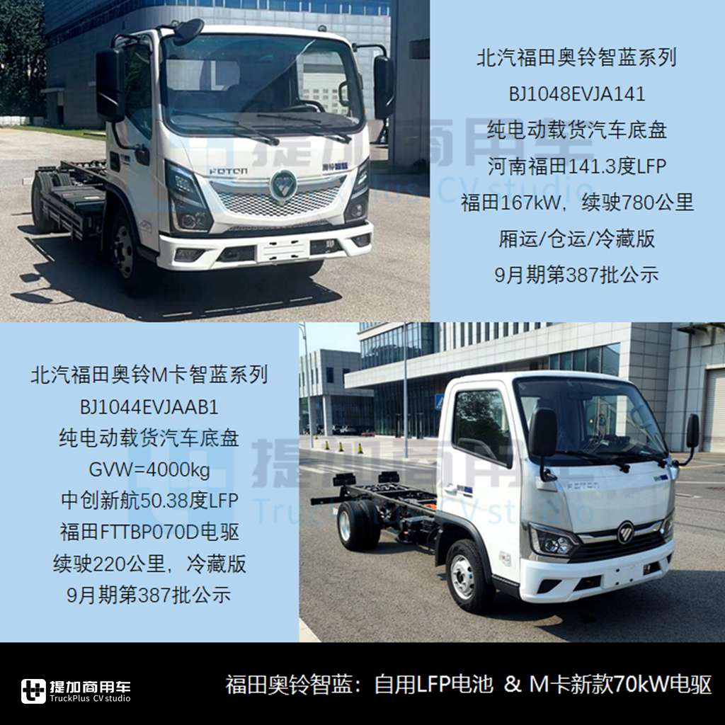 - 另款为奥铃M卡系列BJ1044EVJAAB1纯电动载货汽车底盘以及冷藏版整车,GVW=4000kg,车宽1910mm、准乘2人,较加强型平头小卡要有尺寸规格的优势,轴距2.9米,前3片、后3+2片板簧悬挂,搭载中创新航50.38度LFP动力电池,福田FTTBP070D型70kW电驱系统,续驶220公里,最高85km/h。此前福田已有FTTBP070系列的A款和B款,分别为额定/峰值功率35/70kW和35/75kW,主要为3吨级福田祥菱M/Q系列小卡或智蓝精灵客厢车配套——对比可知本次新品也达到同级电驱的使用上限。