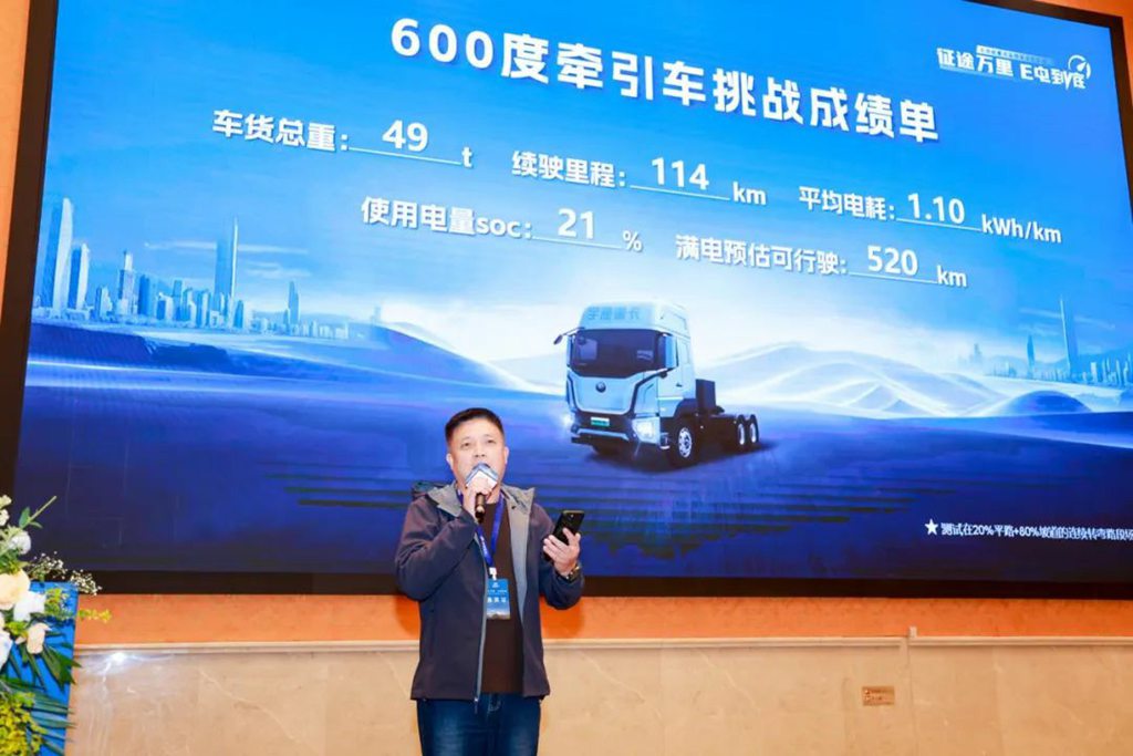 活动现场,襄阳庞大汽车销售有限公司总经理王国彬公布了此次车辆运营数据。宇通600度牵引车在20%平路+80%坡道的连续转弯路段场景下,累计运营里程114公里,最终测试成绩为:在车货总重49吨的情况下,行驶114公里,耗电21%,平均电耗为1.1度/公里,满电预估可行驶520公里。