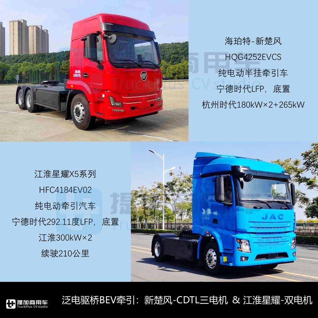 - 江淮重卡申报了星耀X5系列HFC4184EV02纯电动牵引汽车,搭载自用300kW×2单根桥、双电机驱动系统,若折算为燃油车已达816马力、在4×2牵引车型中已是妥妥的“小钢炮”(但不宜直接类比,仅做定性感知,笔者已多次强调)。该车准乘2人,轴距4.2米,前2/3片板簧、后空气悬挂,准拖33.67吨挂车,搭载宁德时代292.11度LFP动力电池、底置方案,续驶210公里。另,一汽申报了解放J6L系列CA4250P62T1BEVC1纯电动半挂牵引车,搭载自用每桥单电机、240kW×2方案,搭载宁德时代400.61度LFP动力电池、后背置方案,准拖39.37吨挂车,续驶184公里,可与上款新品进行直观对比。