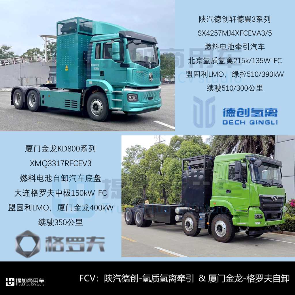- 陕汽德创作为“政产学研用金”全要素融合的创新中心平台,在商用车产业链布局甚广,本批旗下子公司氢质氢离(北京)氢能科技有限公司提供的燃料电池开始为自家产品配套,申报了轩德翼3系列SX4257MJ4XFCEVA3/5两款燃料电池牵引汽车,分别搭载氢质氢离215kW或135kW燃料电池+盟固利LMO,苏州绿控510或390kW电驱系统,准拖36.57-37.67/37.27-38.32吨挂车,续驶510或300公里。其中,前者的燃料电池方案额定功率超过200kW,在行业中处于领先水平;另同月期申报的SX4257MJ4XFCEVA4采用新疆鲲华215kW燃料电池+宁德时代LFP动力电池+苏州绿控420kW,续驶亦为510公里。