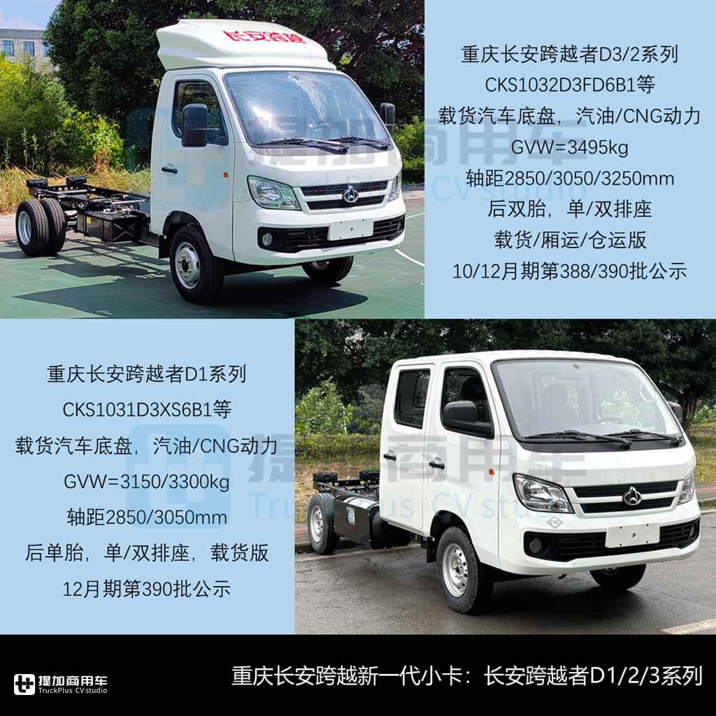 重庆长安跨越10/12月期申报了新一代的跨越者D1/2/3系列新品,合计十款底盘新品以及载货/厢运/仓运版数十款整车,这是继长安新豹T系、跨越王X系之后,长安跨越再次推出的全新3吨级小卡平台,在未来一段时间内也将进行系列化与重点推广。本次新品参照了此前的产品线规划方式,利用基础车宽和后桥单/双胎进行区隔,并提供汽油/CNG动力、单/双排座驾驶室配置。具体: