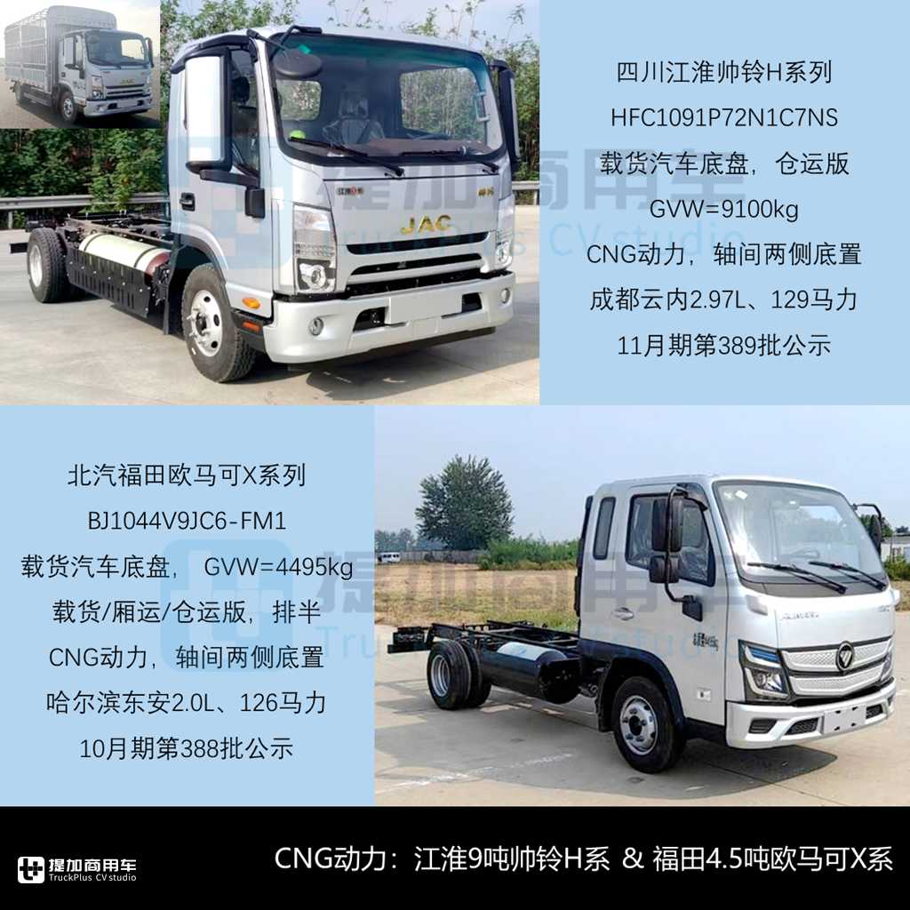 - 4.5吨蓝牌轻卡方面,四季度共有北汽福田欧马可X系列BJ1044V9JC6-FM1(排半,10月期)和BJ1044V9AC6-FM6(双排,11月期)和重汽济商七星悍将系列ZZ1047F3515F145CL(单排,12月期)三款新品采用CNG动力。前者匹配哈尔滨东安2.0L、126马力气体机,整体偏向于加强型3-4吨级小卡的选择;后者匹配潍柴2.97L、140马力气体机,目前只在重汽同系4.5吨轻卡产品上配套,也是潍柴全谱系中规格最小的气体机之一。