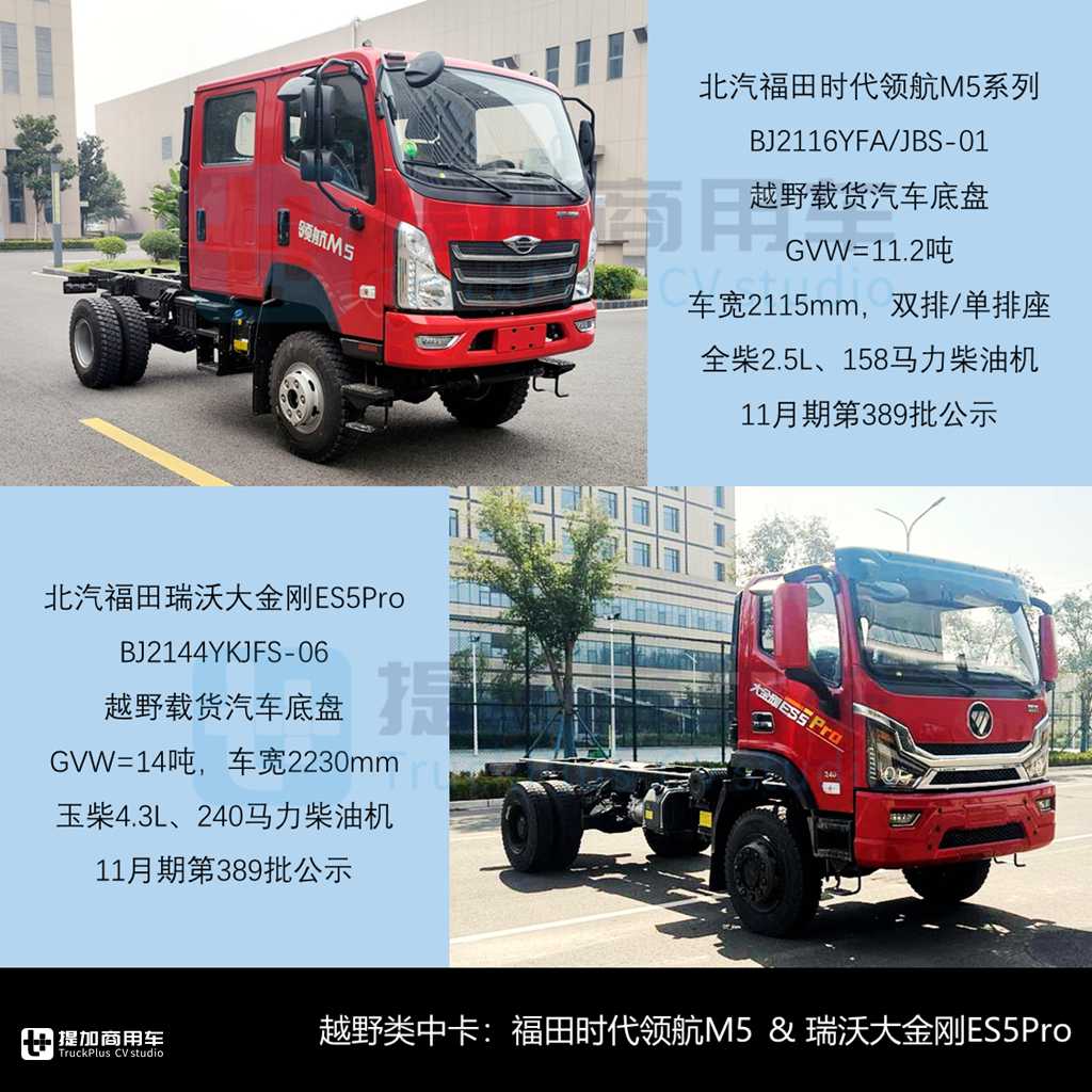 - 首先是福田时代领航M5系列BJ2116YFA/JBS-01两款越野载货汽车底盘,GVW=11.2吨,车宽2115mm、前/后轮距1550/1595mm属“大轻卡”规格,双/单排座驾驶室、准乘3+3或2/3人,轴距3.4米、前8片、后8+5片板簧悬挂,后双胎驱动、8.25吋轮胎,匹配安徽全柴2.5L、158马力柴油机,可选取力器,最高100km/h。