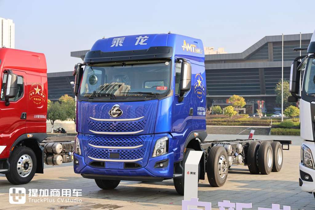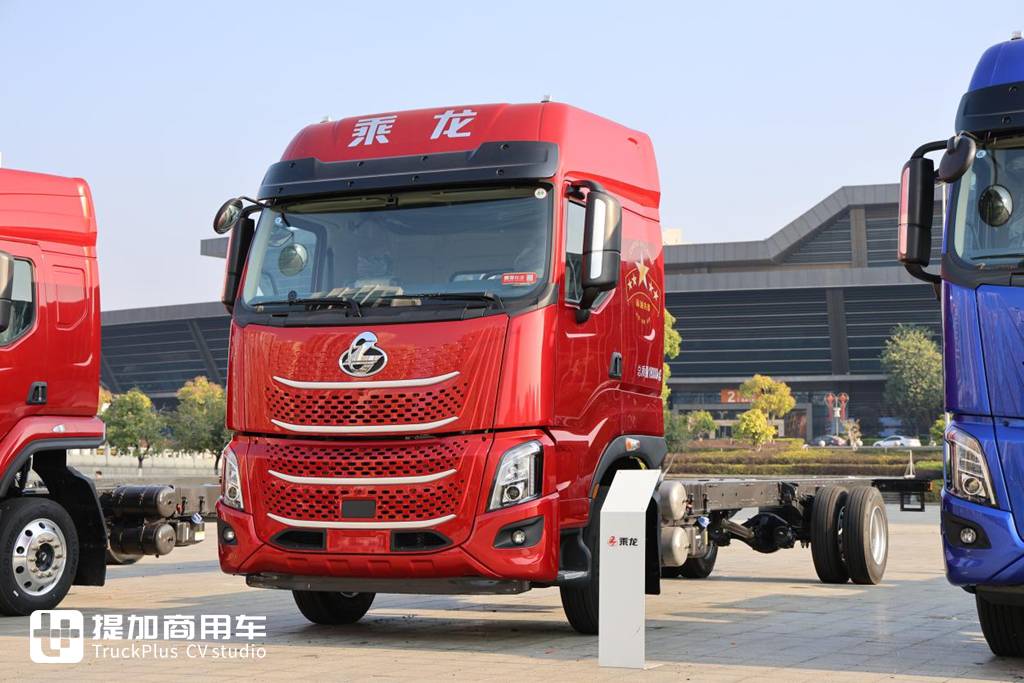 乘龙HK 640马力LNG牵引车:玉柴16升天然气发动机首装,最大马力可达640匹,匹配法士特12速AMT变速箱,带液力缓速器,后桥速比3.364。驾驶室采用HK高端驾驶室,卧铺1100mm宽,标配12.3寸液晶仪表和12.8寸车机,带有360°全景影像、顶置空调等配置。