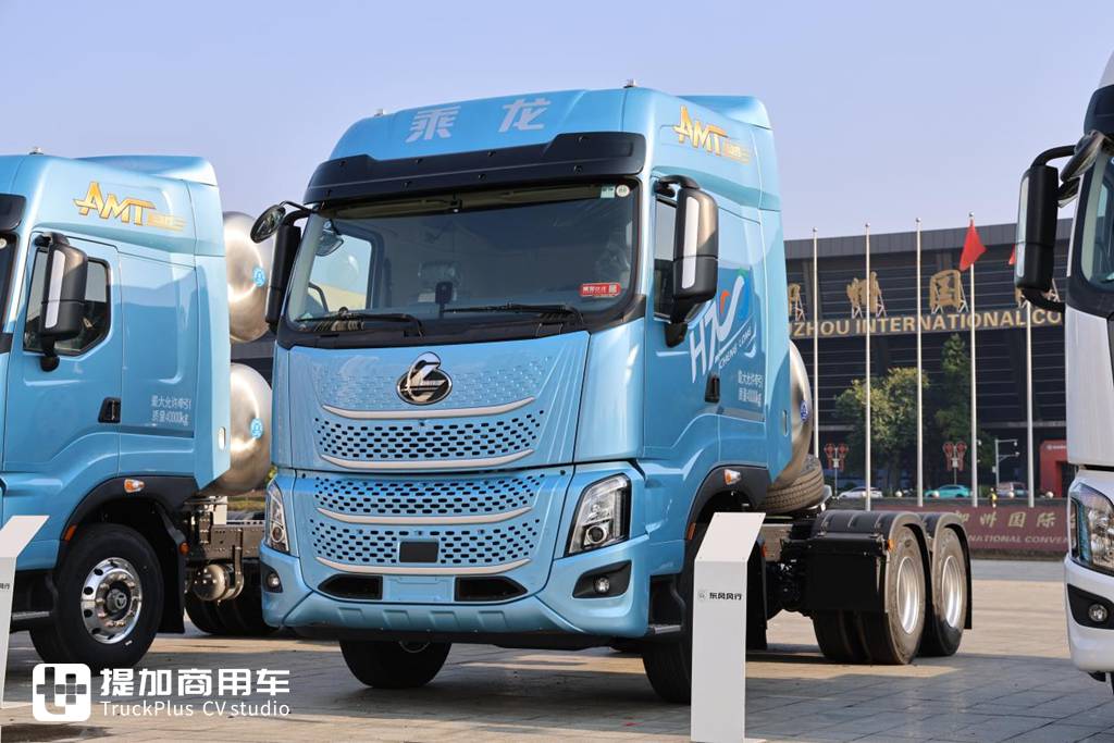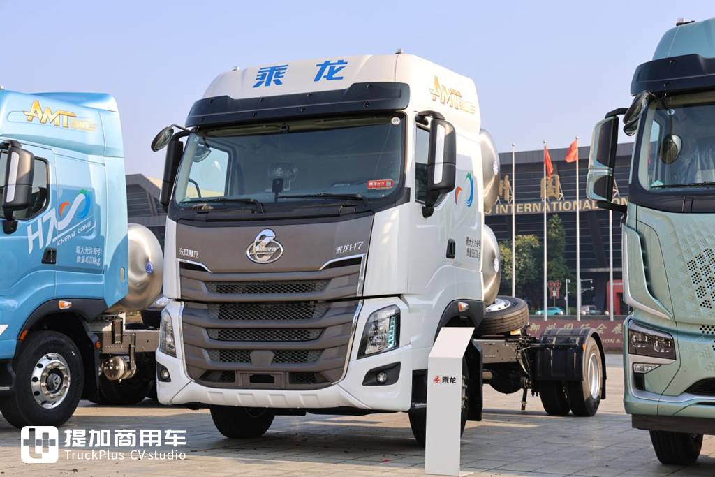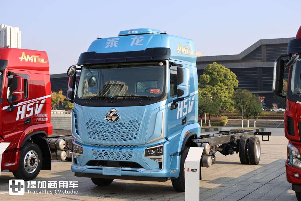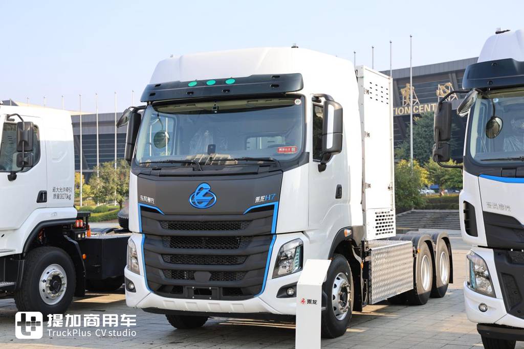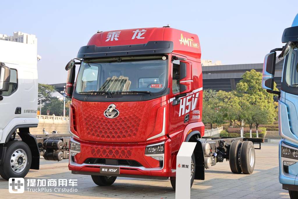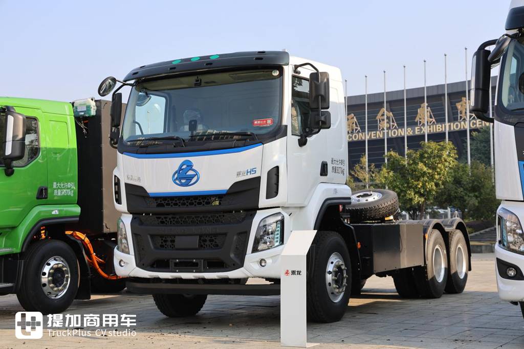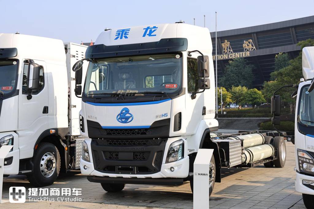 乘龙H5氢燃料载货车:搭载国鸿第三代芯高性能电堆110kw燃料电池发动机,60度盟固利动力电池,4*320L储氢瓶。动力链为朗高165kw电机+6AMT+5.875速比后桥。氢燃料电池是以氢气为燃料,通过化学反应和质子交换将电池中的化学能转变为电能的发电装置,通过绿电实现全生命周期的零碳排放。