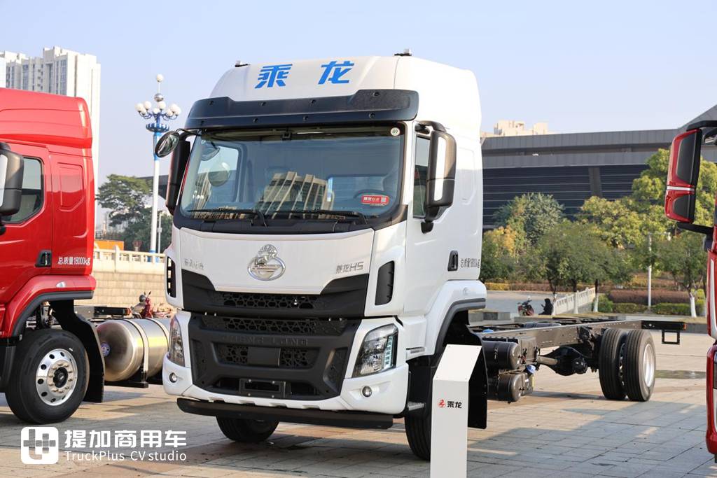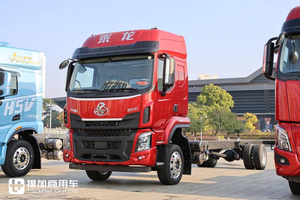 乘龙H5 270马力大单桥:采用H53S进气道前置驾驶室,货箱长度可做到9米8,采用200Ah锂电池电源。搭载YCK05系列四缸发动机,最大270马力,匹配法士特小8挡变速箱和4.11速比后桥,轴距7100mm,属于高性价比低能耗的大单桥车型。