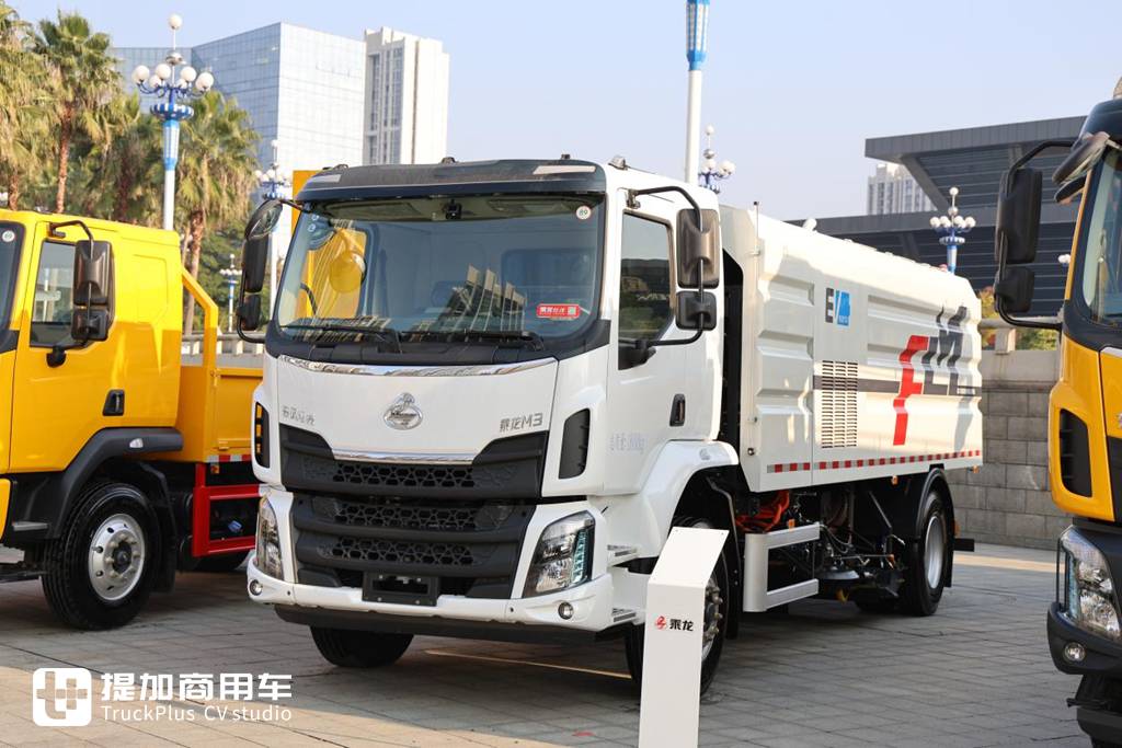 乘龙M3纯电动洗扫车:采用宁德时代282度磷酸铁锂电池,动力链为中央驱动+6挡AMT模式,便于上装取力,中央电机功率180kw。上装福龙马洗扫一体设备,“中置两盘扫+中置V型喷水架+中置双吸口宽吸嘴结构”布置形式。具有多种作业模式,实现路面的清扫、清洗及洗扫。左右扫盘具有避障保护及复位功能、左右高压侧喷杆具有双向自动避障保护及复位功能。