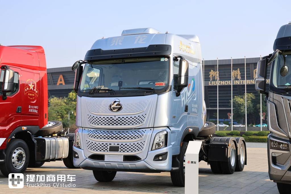 乘龙H7氢燃料牵引车:搭载国鸿第三代鸿芯高性能电堆150kw燃料电池发动机,88.3度动力电池,6*410L储氢瓶。动力链为朗高250/360kw电机+6AMT+5.571速比后桥。氢燃料电池是以氢气为燃料,通过化学反应和质子交换将电池中的化学能转变为电能的发电装置,通过绿电实现全生命周期的零碳排放。