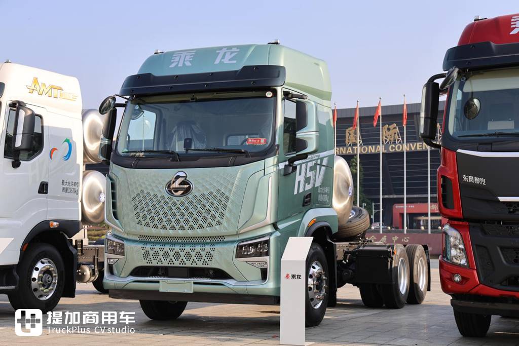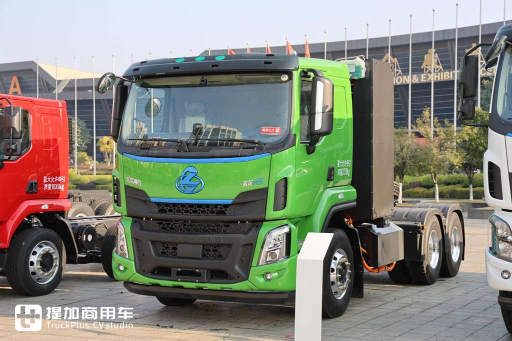 乘龙H5纯电牵引车:采用宁德时代352度第四代长寿命电池+特百佳驱动系统+汇川电控,电池侧置布局,轴距4000mm。采用中央驱动,特百佳双电机,电机功率460kw,匹配4挡AMT,综合电耗低至1.1度每公里。匹配双枪大电流充电,20%~80%充电时间40分钟。