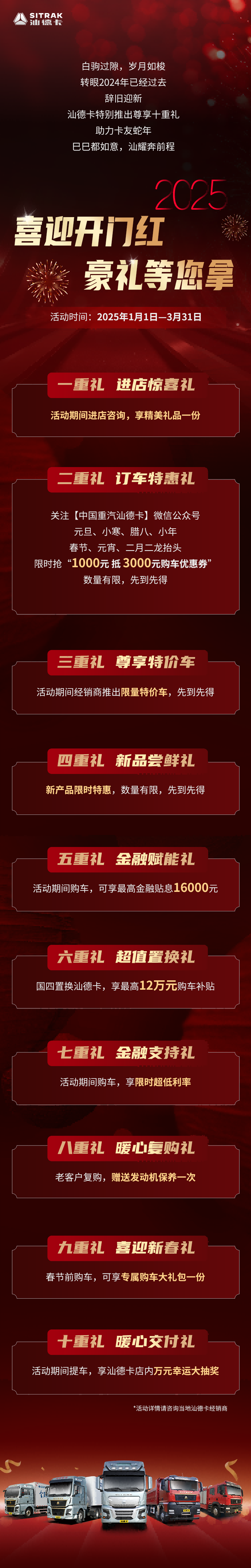 中国重汽汕德卡:喜迎开门红,豪礼等您拿! 张赫 企业快讯, 卡车2025年1月9日 09:417.07W0 中国重汽(1408)本文来源企业提供,经授权后由张赫发布,观点不代表提加商用车网的立场,转载请联系原作者。张赫4.82K419.05M54.12W