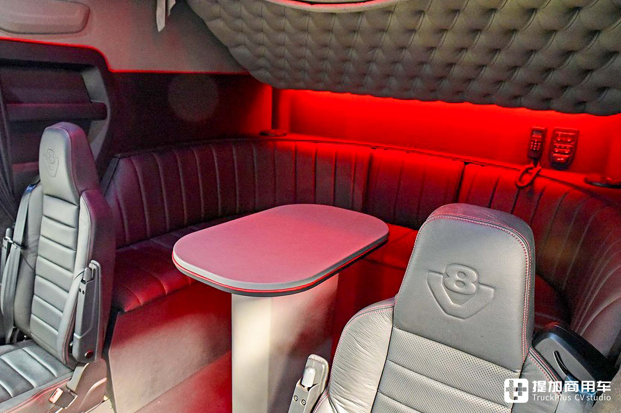 改装厂及车主并没有放出本车的内饰图,就让我们以官方图作为参考吧。得益于超长的驾驶室,车辆直接取消了下卧铺,并增设环形沙发及桌板,可用作会客厅。睡眠通过大尺寸的上卧铺实现,辅以真皮全包,舒适感及豪华感到位。